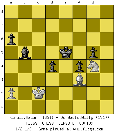 Last move : 1/2-1/2 2010 July 24 14:38:26 [Event "FICGS__CHESS__CLASS_B__000109"] [Site "FICGS"] [Date "2010.04.23"] [Round "1"] [White "Kirali,Hasan"] [Black "De Waele,Willy"] [Result "1/2-1/2"] [WhiteElo "1861"] [BlackElo "1917"] 1.e4 c5 2.Nf3 d6 3.d4 cxd4 4.Nxd4 Nf6 5.Nc3 a6 6.f3 e6 7.Be3 b5 8.Qd2 Nbd7 9.g4 b4 10.Nce2 h6 11.O-O-O Qc7 12.h4 d5 13.Bg2 dxe4 14.g5 hxg5 15.hxg5 Rxh1 16.Bxh1 Nd5 17.g6 Ne5 18.fxe4 Nc4 19.Bf4 Nxf4 20.Qxf4 Qxf4+ 21.Nxf4 Bc5 22.Kb1 e5 23.Nd5 exd4 24.Nc7+ Kd8 25.Nxa8 fxg6 26.Rd3 g5 27.c3 Nxb2 28.Kxb2 bxc3+ 29.Kb3 Be6+ 30.Kc2 Bd7 31.Rg3 Ba4+ 32.Kd3 c2 33.Kd2 Bd6 34.e5 Bxe5 35.Rg4 Bf4+ 36.Rxf4 gxf4 37.Nb6 Bb5 38.Kxc2 g5 39.Bf3 Kc7 40.Nd5+ Kd6 41.Nf6 Ke5 42.Ng4+ 1/2-1/2 Sicilian : Najdorf Queenside Castling by player White (move 11) 10 pieces endgame at move 38 : White KBNP , Black KBPPPP WHITE : King + 1 Bishop 1 Knight 1 Pawn BLACK : King + 1 Bishop 4 Pawns This chess game ended in a draw. Follow this game move after move (download)Chess demands total concentration. (Bobby Fischer) Ich verachte die Medien. (Robert James Fischer) Aún deseo matar a Fischer. (Boris Spassky) La guerre est enfant de la passion, la passion est enfant du narcissisme et le narcissisme est l'enfant. (...) Une autre partie ? (Thibault de Vassal) They say poker is a zero-sum game. It must be, because every time I play my sum ends up zero. (Max Shapiro)