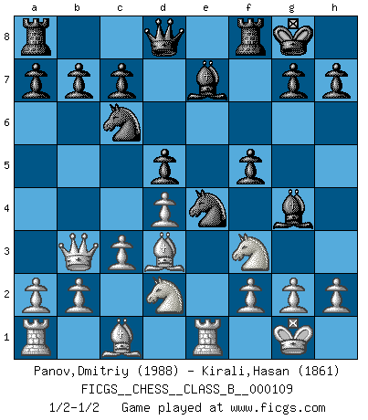 Last move : 1/2-1/2 2010 May 27 12:19:58 [Event "FICGS__CHESS__CLASS_B__000109"] [Site "FICGS"] [Date "2010.04.23"] [Round "1"] [White "Panov,Dmitriy"] [Black "Kirali,Hasan"] [Result "1/2-1/2"] [WhiteElo "1988"] [BlackElo "1861"] 1.e4 e5 2.Nf3 Nf6 3.Nxe5 d6 4.Nf3 Nxe4 5.d4 d5 6.Bd3 Nc6 7.O-O Be7 8.Re1 Bg4 9.c3 f5 10.Qb3 O-O 11.Nbd2 Na5 12.Qa4 Nc6 13.Qb3 Na5 14.Qa4 Nc6 15.Qb3 1/2-1/2 Petrov : Classical attack Kingside Castling by player White (move 7) Kingside Castling by player Black (move 10) This chess game ended in a draw. Follow this game move after move (download)In Chess, at least, the brave inherit the earth. (Edmar Mednis) Wenn Schach ein enormer Dschungel ist, der seine Myriaden von Geheimnissen nicht preisgeben will, dann sind Computer die Kettensägen einer gewaltigen ökologisch unsensiblen Nutzholzfirma. (Nigel Short) Yo nunca en mi vida he jugado la Defensa Francesa, que viene siendo la más aburrida de todas las Aperturas. (Wilhelm Steinitz) Le profane ne songe pas à la somme de jouissance dont il se prive, qui méconnaît ce jeu aux ressources aussi variées que passionnantes. (Jean-Marie Jeanton-Lamarche) Never was anything great achieved without danger. (Niccolo Machiavelli)