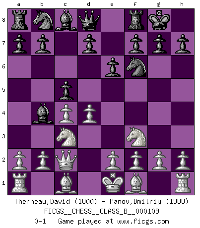 Last move : 0-1 2010 June 8 9:22:31 [Event "FICGS__CHESS__CLASS_B__000109"] [Site "FICGS"] [Date "2010.04.23"] [Round "1"] [White "Therneau,David"] [Black "Panov,Dmitriy"] [Result "0-1"] [WhiteElo "1800"] [BlackElo "1988"] 1.d4 Nf6 2.c4 e6 3.Nc3 Bb4 4.Qc2 O-O 5.Nf3 c5 0-1 This chess game has been lost on time (started : 2010.04.23 23:23:48) Nimzo-Indian : Classical variation Kingside Castling by player Black (move 4) Player Black won this chess game. Follow this game move after move (download)The boy (then a 12 year old boy named Anatoly Karpov) doesn't have a clue about Chess, and there's no future at all for him in this profession. (Mikhail Botvinnik) Ich würde mich als ganz normalen Jungen bezeichnen [Im Alter von 12]. (Sergej Karjakin) El pensamiento metódico es mas útil en el Ajedrez que la inspiración. (C. J. S. Purdy) Les Echecs ont trois composantes : le temps, l'espace et le matériel en dernier. (Mikhail Tal) There's always a bigger fish. (Qui-Gon Jinn in Star Wars ep.1)