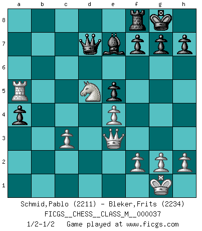 Last move : 1/2-1/2 2010 October 2 8:48:41 [Event "FICGS__CHESS__CLASS_M__000037"] [Site "FICGS"] [Date "2010.04.24"] [Round "1"] [White "Schmid,Pablo"] [Black "Bleker,Frits"] [Result "1/2-1/2"] [WhiteElo "2211"] [BlackElo "2234"] 1.e4 c5 2.Nc3 Nc6 3.Nf3 Nf6 4.d4 cxd4 5.Nxd4 e5 6.Ndb5 d6 7.Bg5 a6 8.Na3 b5 9.Nd5 Be7 10.Bxf6 Bxf6 11.c3 Rb8 12.Nc2 Bg5 13.a4 bxa4 14.Ncb4 Nxb4 15.Nxb4 Bd7 16.Bxa6 Qa5 17.Qxd6 Rb6 18.Qd3 Be7 19.Nd5 Rxb2 20.O-O Qc5 21.Rab1 Rxb1 22.Rxb1 O-O 23.Bb5 Bxb5 24.Rxb5 Qa7 25.Qe3 Qd7 26.Ra5 1/2-1/2 Sicilian : Closed, 2...Nc6 Kingside Castling by player White (move 20) Kingside Castling by player Black (move 22) This chess game ended in a draw. Follow this game move after move (download)I thought the most common mistake [in chess] was the first one: Learning the game :P (Garvin Gray, FICGS forum) Schach ist ein Teil der Kultur, und wenn es mit der Kultur abwärts geht, geht es auch mit dem Schach abwärts. (Mikhail Moiseyevich Botvinik) El Ajedrez es un expediente tonto que hace creer a la gente inactiva que hacen una cosa muy astuta cuando solamente estan perdiendo su tiempo. (George Bernard Shaw) On entre au jeu d'Echecs comme on entre en Religion. Pour le joueur d'Echecs, la partie d'Echecs c'est l'office, la messe, le défilé du 1er Mai, le dépôt de gerbe au Monument aux Morts. C'est un drame sacré. (Michel Roos) Political correctness is subjecting us to gross incompetence. (Johann Piek)