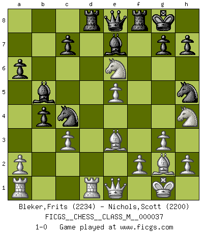 Last move : 1-0 2010 April 29 14:28:26 [Event "FICGS__CHESS__CLASS_M__000037"] [Site "FICGS"] [Date "2010.04.24"] [Round "1"] [White "Bleker,Frits"] [Black "Nichols,Scott"] [Result "1-0"] [WhiteElo "2234"] [BlackElo "2200"] 1.d4 Nf6 2.c4 e6 3.g3 d5 4.Bg2 dxc4 5.Nf3 a6 6.O-O Nc6 7.e3 Bd7 8.Nc3 Bd6 9.Qe2 b5 10.e4 Be7 11.Rd1 O-O 12.Bf4 Na5 13.d5 b4 14.dxe6 fxe6 15.e5 Nh5 16.Bd2 Qe8 17.Ne4 Rd8 18.Be3 Qg6 19.Neg5 c3 20.bxc3 Bb5 21.Qe1 Nc4 22.Nh4 Qe8 23.Nxe6 1-0 Catalan : Open, 5.Nf3 Kingside Castling by player White (move 6) Kingside Castling by player Black (move 11) Player White won this chess game. Follow this game move after move (download)There is no remorse like the remorse of Chess. (H. G. Wells) Mein Name ist Rustam Kamsky. Sie haben meinen Sohn belästigt. Bereiten Sie sich aufs Sterben vor. (Rustam Kamsky) Yo siempre he tenido un ligero sentimiento de lástima por una persona que no tiene conocimiento del Ajedrez. (Siegbert Tarrasch) À la honte des hommes, on sait que les lois du jeu sont les seules qui soient partout justes, claires, inviolables et exécutées. Pourquoi l'Indien qui a donné les règles du jeu d'échecs est-il obéi de bon gré dans toute la terre, et que les décrétales des papes, par exemple, sont aujourd'hui un objet d'horreur et de mépris ? C'est que l'inventeur des échecs combina tout avec justesse pour la satisfaction des joueurs, et que les papes, dans leurs décrétales, n'eurent en vue que leur seul avantage. L'Indien voulut exercer également l'esprit des hommes et leur donner du plaisir; les papes ont voulu abrutir l'esprit des hommes. Voltaire (Dictionnaire philosophique / Garnier 1967) Pushing plastic is for the many, pushing virtual pieces is for the fewer, pushing wood is for the very few. (Normajean Yates)
