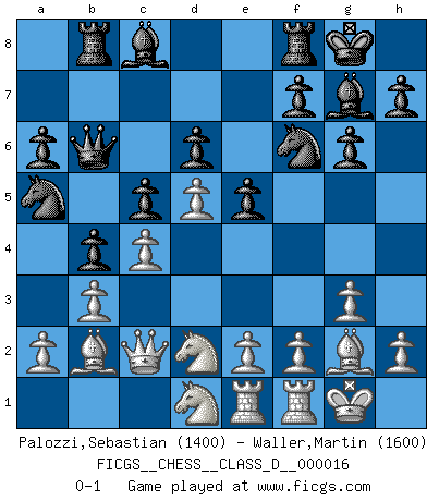Last move : 0-1 2006 December 1 17:29:54 [Event "FICGS__CHESS__CLASS_D__000016"] [Site "FICGS"] [Date "2006.10.30"] [Round "1"] [White "Palozzi,Sebastian"] [Black "Waller,Martin"] [Result "0-1"] [WhiteElo "1400"] [BlackElo "1600"] 1.d4 Nf6 2.c4 g6 3.Nf3 Bg7 4.g3 O-O 5.Bg2 d6 6.O-O c5 7.Nc3 Nc6 8.d5 Na5 9.Nd2 a6 10.Qc2 Rb8 11.b3 b5 12.Bb2 e5 13.Rae1 Qb6 14.Nd1 b4 0-1 King's Indian, 3.Nf3 Kingside Castling by player Black (move 4) Kingside Castling by player White (move 6) Player Black won this chess game. Follow this game move after move (download)The King is a fighting piece. Use it ! (Wilhelm Steinitz) Es ist besser die Steine des Gegners zu opfern. (Savielly Grigorievitsch Tartakower) El Ajedrez te enseña a controlarl la excitación inicial que sientes cuando vez algo que parece bueno y te enseña a pensar objetivamente cuando te encuentras en problemas. (Stanley Kubrick) Le profane ne songe pas à la somme de jouissance dont il se prive, qui méconnaît ce jeu aux ressources aussi variées que passionnantes. (Jean-Marie Jeanton-Lamarche) Man is reluctant to give credit for intelligence to anyone, except his enemies. (Albert Einstein)