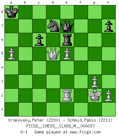 Last move : 0-1 2011 May 25 18:45:21 [Event "FICGS__CHESS__CLASS_M__000037"] [Site "FICGS"] [Date "2010.04.24"] [Round "1"] [White "Krakovsky,Peter"] [Black "Schmid,Pablo"] [Result "0-1"] [WhiteElo "2200"] [BlackElo "2211"] 1.e4 e5 2.Nf3 Nc6 3.Bb5 f5 4.Nc3 fxe4 5.Nxe4 d5 6.Nxe5 dxe4 7.Nxc6 Qg5 8.Qe2 Nf6 9.f4 Qxf4 10.Nxa7 Bd7 11.Bxd7+ Kxd7 12.Qb5+ Ke6 13.Qb3+ Kd7 14.Qxb7 Bd6 15.Qb5+ Ke6 16.Qb3+ Kd7 17.Qf7+ Kd8 18.Nc6+ Kc8 19.Ne7+ Bxe7 20.Qxe7 Re8 21.Qc5 Ra6 22.g3 Qh6 23.b3 e3 24.dxe3 Nd7 25.Qc4 Ne5 26.Qe2 Rf8 27.e4 Qc6 28.Bd2 Qf6 29.Bf4 Nf3+ 30.Kf2 Nd4 31.Qg4+ Ne6 32.Rhf1 g5 33.Kg2 gxf4 34.Rxf4 Qxa1 35.Rxf8+ Kb7 36.Rf2 Qc3 37.a4 Nd4 38.e5 Qc6+ 39.Kh3 Qd5 40.Qf4 Rg6 41.c4 Qe6+ 42.Kg2 Qc6+ 43.Kg1 Qc5 44.Kg2 Qc6+ 45.Kg1 Nxb3 46.Rb2 Qc5+ 47.Kf1 Rb6 48.Qf3+ Kb8 49.Qd5 Qe7 50.Rf2 Nc5 51.Kg2 Re6 52.Rb2+ Ka7 53.Re2 Na6 54.c5 Nxc5 55.Qd4 Ka8 56.a5 Nd7 57.Qd5+ c6 0-1 This chess game has been lost on time (started : 2010.04.24 8:37:11) Ruy Lopez : Schliemann defense, Berger variation Player Black won this chess game. Follow this game move after move (download)We must make sure that Chess will not be like a dead language, very interesting, but for a very small group. (Sytze Faber) Ein guter Spieler hat immer Glück. (José Raúl Capablanca) El Ajedrez es la vida. (Bobby Fischer) Des points faibles ou des trous dans la position de l'adversaire doivent être occupés par des pièces et non pas par des pions. (Siegbert Tarrasch) Memory... is the diary that we all carry with us. (Oscar Wilde, The Importance of Being Earnest)