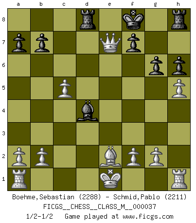 Last move : 1/2-1/2 2010 October 21 10:50:23 [Event "FICGS__CHESS__CLASS_M__000037"] [Site "FICGS"] [Date "2010.04.24"] [Round "1"] [White "Boehme,Sebastian"] [Black "Schmid,Pablo"] [Result "1/2-1/2"] [WhiteElo "2288"] [BlackElo "2211"] 1.d4 Nf6 2.Nf3 g6 3.c4 Bg7 4.Nc3 d5 5.Bg5 Ne4 6.cxd5 Nxg5 7.Nxg5 e6 8.Qd2 exd5 9.Qe3+ Kf8 10.h4 h6 11.Nf3 c5 12.dxc5 Nc6 13.Qd2 Be6 14.e3 Qe7 15.h5 d4 16.Nxd4 Nxd4 17.exd4 Rd8 18.Ne2 Bg4 19.Qe3 Bxe2 20.Bxe2 Bxd4 21.Qxe7+ 1/2-1/2 King's Indian : East Indian defense This chess game ended in a draw. Follow this game move after move (download)The mistakes are there, waiting to be made. (Savielly Tartakower) Ein Buch ist ein Spiegel; wenn ein Affe hineinsieht, so kann kein Apostel heraus gucken. (Georg Christoph Lichtenberg) Cuando tengo las piezas blancas, yo gano porque soy blanco; Cuando tengo las piezas negras, yo gano porque soy Bogolyubov. (Bogolyubov) Karpov est une pièce de musée. (Garry Kasparov) How many people work in NATO Headquarters ? - About half of them. (Dirk Stikker, NATO general secretary)