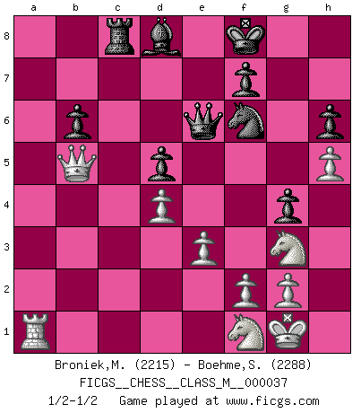 Last move : 1/2-1/2 2011 April 29 8:22:11 [Event "FICGS__CHESS__CLASS_M__000037"] [Site "FICGS"] [Date "2010.04.24"] [Round "1"] [White "Broniek,Mariusz Maciej"] [Black "Boehme,Sebastian"] [Result "1/2-1/2"] [WhiteElo "2215"] [BlackElo "2288"] 1.d4 d5 2.c4 e6 3.Nc3 Nf6 4.Bg5 Be7 5.e3 O-O 6.Nf3 h6 7.Bh4 b6 8.Be2 Bb7 9.Bxf6 Bxf6 10.cxd5 exd5 11.b4 c6 12.O-O Re8 13.Qb3 a5 14.bxa5 Rxa5 15.a4 Nd7 16.Rab1 g6 17.Rfd1 Kg7 18.Bd3 Qc7 19.h4 Bd8 20.h5 g5 21.Ne2 g4 22.Nd2 Nf6 23.Ng3 Bc8 24.Bf5 Kf8 25.Bxc8 Qxc8 26.Rdc1 Qe6 27.Qc3 Re7 28.Ndf1 Rea7 29.Qxc6 Rxa4 30.Qc8 Ra8 31.Qc3 Rc4 32.Qb2 Rxc1 33.Rxc1 Ra7 34.Qb5 Rc7 35.Ra1 Rc8 1/2-1/2 QGD : Tartakower (Makagonov-Bondarevsky) system Kingside Castling by player Black (move 5) Kingside Castling by player White (move 12) This chess game ended in a draw. Follow this game move after move (download)There are two types of sacrifices: correct ones and mine. (Mikhail Tal) Wenn Du einsam bist, wenn Du Dich in der Welt wie ein Fremder fühlst, spiele Schach. Das wird Deinen Geist erheben und Dein Ratgeber im Kampf sein. (Aristoteles) Siempre es mucho mejor sacrificar las piezas de tu oponente. (Savielly Tartakover) Je fais ceci parce que dans cinquante coups j'obtiendrai cela; je m'appelle Mikhail Moisevitch Botvinnik. (Botvinnik) All war is based on deception. (Sun Tzu)