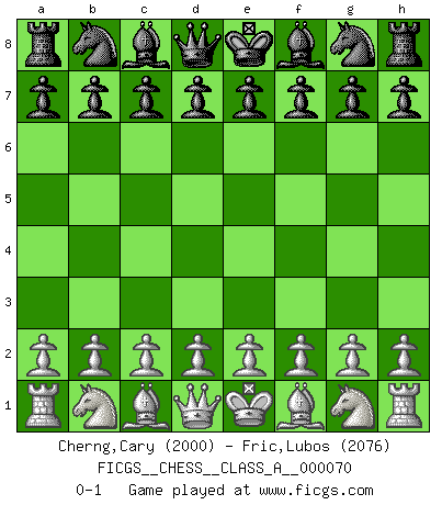 Last move : 0-1 2010 June 6 9:10:34 [Event "FICGS__CHESS__CLASS_A__000070"] [Site "FICGS"] [Date "2010.04.24"] [Round "1"] [White "Cherng,Cary"] [Black "Fric,Lubos"] [Result "0-1"] [WhiteElo "2000"] [BlackElo "2076"] 0-1 This chess game has been lost on time (started : 2010.04.24 18:15:0) Player Black won this chess game. Follow this game move after move (download)I have never in my life played the French Defence, which is the dullest of all openings. (Wilhelm Steinitz) Vom Schach wurde gesagt das Leben sei dafür nicht lange genug. Aber das ist der Fehler des Lebens, nicht des Schach'. (Irving Chernev) Alekhine es un poeta que crea un trabajo de arte de algo que raramente inspiraría a otra persona a mandar una tarjeta postal. (Max Euwe) Nous sommes les pions de la mystérieuse partie d'Echecs jouée par Dieu. Il nous déplace, nous arrête, nous pousse encore, puis nous lance un à un dans la boîte du Néant. Epitaphe sur la tombe de David Janowsky (1868-1927). Computers have lots of memory but no imagination. (Anonymous)