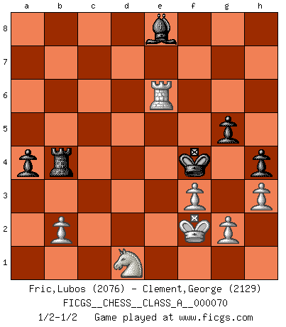 Last move : 1/2-1/2 2011 February 28 16:50:47 [Event "FICGS__CHESS__CLASS_A__000070"] [Site "FICGS"] [Date "2010.04.24"] [Round "1"] [White "Fric,Lubos"] [Black "Clement,George"] [Result "1/2-1/2"] [WhiteElo "2076"] [BlackElo "2129"] 1.e4 e5 2.Nf3 Nc6 3.Bb5 a6 4.Ba4 Nf6 5.O-O Bd6 6.d3 O-O 7.Nc3 Na5 8.Bg5 b5 9.Bb3 h6 10.Bh4 Bb7 11.d4 exd4 12.Qxd4 Nc6 13.Qd3 Re8 14.a4 bxa4 15.Rxa4 a5 16.Nd5 Be7 17.Nxf6+ Bxf6 18.Bxf6 Qxf6 19.Qxd7 Re7 20.Qd5 Nd8 21.Qd3 Ba6 22.e5 Qc6 23.c4 Rd7 24.Qf5 Bb7 25.c5 Ne6 26.Rg4 a4 27.Bxe6 fxe6 28.Qg6 Kh8 29.Rb4 Ba6 30.Re1 Bb5 31.h3 Qxc5 32.Rh4 Qe7 33.Ng5 Bd3 34.Qxe6 c5 35.Qg4 Rd5 36.Re3 Bg6 37.Nf3 Be8 38.Kh2 Rb8 39.Qf5 Rb6 40.Rf4 Kg8 41.Qc2 Qb7 42.Re2 Qe7 43.Qc4 Qe6 44.Qc1 Qe7 45.Rfe4 Qe6 46.R2e3 Qd7 47.Rc4 Qb7 48.Rc2 Qe7 49.Rd2 Rxd2 50.Qxd2 Rb4 51.Ne1 Qe6 52.Nd3 Rd4 53.Qc3 Rc4 54.Qa5 Rc2 55.Rg3 Kh7 56.Qe1 Rc4 57.Qe2 Qd5 58.e6 Rd4 59.Qc2 Rc4 60.Qb1 Rd4 61.Nxc5 Kh8 62.Nd3 Qxe6 63.Qc1 Kh7 64.Qc7 Qf6 65.Ne5 Rd2 66.Rf3 Qd6 67.Qxd6 Rxd6 68.Re3 Rb6 69.Re2 Rb3 70.Rd2 Rb4 71.f3 g5 72.Kg3 Bb5 73.Ng4 h5 74.Nf6+ Kg6 75.Ne4 h4+ 76.Kf2 Kf5 77.Nc3 Bc6 78.Nd1 Kf4 79.Rd6 Be8 80.Re6 1/2-1/2 Ruy Lopez : 5.O-O Kingside Castling by player White (move 5) Kingside Castling by player Black (move 6) This chess game ended in a draw. Follow this game move after move (download)He who fears an isolated Queen's Pawn should give up Chess. (Siegbert Tarrasch) Schach ist ein Teil der Kultur, und wenn es mit der Kultur abwärts geht, geht es auch mit dem Schach abwärts. (Mikhail Moiseyevich Botvinik) Debes de llevar a tu oponente hacia un profundo y obscuro bosque donde 2+2=5, y el camino que conduce a la salida es suficientemente ancho para solamente uno. (Mikhail Tal) Il s'avisa de me proposer d'apprendre les échecs qu'il jouait un peu... me voilà forcené des échecs. J'achète un échiquier, je m'enferme dans ma chambre, j'y passe des jours et des nuits à vouloir apprendre par cur toutes les parties. (Jean-Jacques Rousseau, Confessions) It's not the size of the dog in the fight, it's the size of the fight in the dog. (Mark Twain)