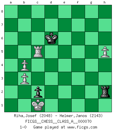 Last move : 1-0 2010 December 6 21:1:39 [Event "FICGS__CHESS__CLASS_A__000070"] [Site "FICGS"] [Date "2010.04.24"] [Round "1"] [White "Riha,Josef"] [Black "Helmer,Janos"] [Result "1-0"] [WhiteElo "2048"] [BlackElo "2143"] 1.e4 c5 2.Ne2 Nc6 3.d4 cxd4 4.Nxd4 Nf6 5.Nc3 d6 6.Bg5 e6 7.Qd2 a6 8.O-O-O Bd7 9.f4 b5 10.Bxf6 gxf6 11.Kb1 Qb6 12.Nxc6 Bxc6 13.f5 Qc5 14.Bd3 h5 15.fxe6 fxe6 16.Qf4 Qe5 17.Qf2 Bg7 18.Rhe1 O-O 19.Nd5 Rf7 20.c3 f5 21.Qb6 Rc8 22.exf5 Qxd5 23.fxe6 Rb7 24.Qe3 Qc5 25.Qg3 Be8 26.Be4 Re7 27.Rd5 Qc7 28.Bc2 Qb7 29.Rxd6 b4 30.Qd3 Bf8 31.Rd5 Bh6 32.Rd7 Bxd7 33.Qg6+ Rg7 34.Qxh6 bxc3 35.Bb3 Ba4 36.e7 Bxb3 37.e8Q+ Rxe8 38.Rxe8+ Kf7 39.Qxh5+ Rg6 40.axb3 c2+ 41.Kc1 Qxg2 42.Re5 Kg8 43.Qh4 Qg1+ 44.Re1 Qg5+ 45.Qxg5 Rxg5 46.Re6 a5 47.h4 Rg2 48.Re5 Kf7 49.Rxa5 Rh2 50.h5 Ke7 51.b4 Kd7 52.Rc5 Kd6 53.b3 1-0 Sicilian : Keres variation (2.Ne2) Queenside Castling by player White (move 8) Kingside Castling by player Black (move 18) Promotion Queen by player White (move 37) 10 pieces endgame at move 45 : White KQRPPP , Black KRPP WHITE : King + 1 Queen 1 Rook 3 Pawns BLACK : King + 1 Rook 2 Pawns 9 pieces endgame at move 45 : White KRPPP , Black KRPP WHITE : King + 1 Rook 3 Pawns BLACK : King + 1 Rook 2 Pawns 8 pieces endgame at move 49 : White KRPPP , Black KRP WHITE : King + 1 Rook 3 Pawns BLACK : King + 1 Rook 1 Pawn Player White won this chess game. Follow this game move after move (download)Chess is a terrific way for kids to build self image and self esteem. (Saudin Robovic) Stelle das Brett so, daß die Sonne in die Augen deines Gegners scheint. (Ruy López) Aquel que toma al Peón de Caballo de la Reina, se pasará la noche a dormir en la calle. (Anónimo) Des points faibles ou des trous dans la position de l'adversaire doivent être occupés par des pièces et non pas par des pions. (Siegbert Tarrasch) Home computers are being called upon to perform many new functions, including the consumption of homework formerly eaten by the dog. (Doug Larson)