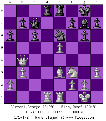 Last move : 1/2-1/2 2010 May 14 22:27:58 [Event "FICGS__CHESS__CLASS_A__000070"] [Site "FICGS"] [Date "2010.04.24"] [Round "1"] [White "Clement,George"] [Black "Riha,Josef"] [Result "1/2-1/2"] [WhiteElo "2129"] [BlackElo "2048"] 1.e4 g6 2.d4 Bg7 3.Nc3 d6 4.Nf3 Nf6 5.Be2 O-O 6.O-O Bg4 7.Be3 Nbd7 8.Qd2 Rc8 9.Rad1 c6 10.h3 Bxf3 11.Bxf3 Qc7 12.Ne2 Rfd8 13.Rfe1 e5 14.Bg5 Re8 15.c3 exd4 16.Nxd4 Ne5 17.Qc2 Qa5 18.Bf4 Nxf3+ 19.Nxf3 d5 20.e5 Nd7 21.b3 Nc5 22.c4 dxc4 23.Qxc4 Ne6 24.Bd2 Qc7 25.Be3 Rcd8 26.Qa4 a6 27.Qb4 1/2-1/2 Robatsch defense : Two knights variation Kingside Castling by player Black (move 5) Kingside Castling by player White (move 6) This chess game ended in a draw. Follow this game move after move (download)I am the best player in the world and I am here to prove it. (Bobby Fischer) Über Kasparov: Es ist offensichtlich, daß er in einem totalitären Staat aufwuchs und deshalb zu diktatorischen Zügen neigt. (Viktor Kortschnoi) ¿Se han dado cuenta de que Fischer casi nunca ha tenido piezas malas? El las intercambia y las piezas malas se quedan con sus oponenets. (Yuri Balashov) Le pion, dans sa simplicité, marche droit devant lui, mais lorsqu'il prend, il le fait obliquement? Ainsi l'homme, tant qu'il reste pauvre, marche dans la droiture et vit honnêtement, mais lorsqu'il recherche les honneurs, il flatte, se parjure et, par les voies obliques, cherche une position supérieure sur l'échiquier du monde. (Jean de Galles) All art requires courage. (Anne Tucker)