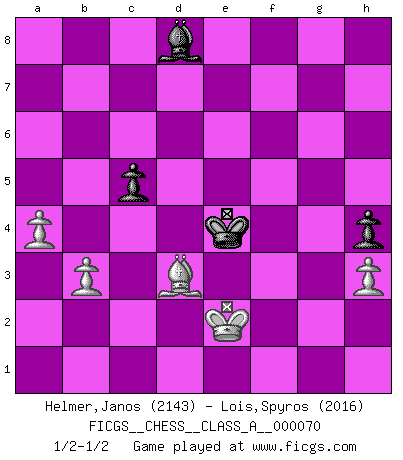Last move : 1/2-1/2 2010 September 21 23:23:22 [Event "FICGS__CHESS__CLASS_A__000070"] [Site "FICGS"] [Date "2010.04.24"] [Round "1"] [White "Helmer,Janos"] [Black "Lois,Spyros"] [Result "1/2-1/2"] [WhiteElo "2143"] [BlackElo "2016"] 1.c4 e5 2.Nc3 Nc6 3.g3 g6 4.Bg2 Bg7 5.e3 Nge7 6.Nge2 O-O 7.O-O d6 8.d4 exd4 9.exd4 Nf5 10.d5 Ne5 11.b3 Re8 12.Bb2 c5 13.dxc6 bxc6 14.Qc2 Nh6 15.Rad1 Bg4 16.h3 Bf3 17.Ba3 Nf5 18.Bxd6 Nxd6 19.c5 Qg5 20.cxd6 Rad8 21.Rd2 Qf6 22.Rfd1 Bh6 23.d7 Re6 24.Rd4 c5 25.Ne4 Bxe4 26.Rxe4 Rxd7 27.Nc3 Rxd1+ 28.Qxd1 Bg7 29.Qd5 h5 30.Re2 Qe7 31.Kh2 h4 32.Qa8+ Qf8 33.Qxa7 Nd3 34.Rxe6 fxe6 35.Qd7 Bd4 36.Qxe6+ Kg7 37.Ne4 Nxf2 38.Qd7+ Kh6 39.Qd6 Qf5 40.Qf4+ Qxf4 41.gxf4 Nxe4 42.Bxe4 Be3 43.f5 gxf5 44.Bxf5 Kg5 45.Bh7 Kf4 46.Kg2 Bd2 47.Kf2 Bb4 48.Ke2 Kg3 49.Bf5 Kf4 50.Bd7 Ke4 51.a4 Ba5 52.Bb5 Bd8 53.Bd3+ 1/2-1/2 English : Closed system Kingside Castling by player Black (move 6) Kingside Castling by player White (move 7) 10 pieces endgame at move 43 : White KBPPP , Black KBPPP WHITE : King + 1 Bishop 3 Pawns BLACK : King + 1 Bishop 3 Pawns 9 pieces endgame at move 44 : White KBPPP , Black KBPP WHITE : King + 1 Bishop 3 Pawns BLACK : King + 1 Bishop 2 Pawns This chess game ended in a draw. Follow this game move after move (download)Modern Chess is too much concerned with things like Pawn structure. Forget it, Checkmate ends the game. (Nigel Short) Ein Kibitz ist einer, der deinem Gegner gute Ratschläge gibt. (Andrew Soltis) No es una movida, aún la mejor movida que tu debas buscar, sino un plan comprensible. (Eugene Znosko-Borovsky) Le génie consiste à savoir transgresser les règles au moment opportun. (Teichmann) Lottery : A tax on people who are bad at math. (Author unknown)