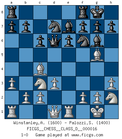 Last move : 1-0 2006 December 6 21:9:37 [Event "FICGS__CHESS__CLASS_D__000016"] [Site "FICGS"] [Date "2006.10.30"] [Round "1"] [White "Winstanley,Anthony"] [Black "Palozzi,Sebastian"] [Result "1-0"] [WhiteElo "1600"] [BlackElo "1400"] 1.e4 d5 2.exd5 Qxd5 3.Nf3 Nf6 4.Be2 Bg4 5.O-O e6 6.Nc3 Qd6 7.h3 Bh5 8.Re1 c6 9.Nh2 Bg6 10.Bc4 Be7 11.d3 Nbd7 12.a3 O-O 13.Bg5 1-0 Scandinavian (centre counter) defense Kingside Castling by player White (move 5) Kingside Castling by player Black (move 12) Player White won this chess game. Follow this game move after move (download)Any material change in a position must come about by mate, a capture, or a Pawn promotion. (Purdy) Ich brauche nur einen Blick auf das Schachbrett zu werfen, und weiß schon, was in der Stellung steckt, was geschehen kann und was geschehen wird. Alle übrigen suchen und prüfen, ich aber weiß es! (José Raúl Capablanca) Morphy probablemente fue el genio más grande de todos. (Bobby Fischer) Ce qui est bien, c'est d'avoir tout un tas de pièces en prise : l'adversaire ne peut en prendre qu'une à la fois. Cité par Thierry Audin. Establishing goals is all right if you don't let them deprive you of interesting detours. (Doug Larson)