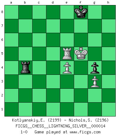 Last move : 1-0 2010 April 24 22:26:8 [Event "FICGS__CHESS__LIGHTNING_SILVER__000014"] [Site "FICGS"] [Date "2010.04.24"] [Round "1"] [White "Kotlyanskiy,Edward"] [Black "Nichols,Scott"] [Result "1-0"] [WhiteElo "2199"] [BlackElo "2196"] 1.d4 Nf6 2.c4 g6 3.g3 Bg7 4.Nf3 O-O 5.Bg2 d6 6.Nc3 c6 7.O-O Qa5 8.Bd2 Qh5 9.Qb3 e5 10.dxe5 dxe5 11.Ng5 h6 12.Nge4 Nbd7 13.Rad1 a5 14.Rfe1 Nxe4 15.Nxe4 Nf6 16.Nd6 e4 17.Bf4 Qc5 18.a4 Be6 19.Be3 Qh5 20.Bd4 Ng4 21.h3 Bxd4 22.Rxd4 Nf6 23.Qxb7 e3 24.Qxc6 exf2+ 25.Kxf2 Bxh3 26.Bxh3 Qxh3 27.Qf3 Qe6 28.Red1 Rab8 29.R1d2 h5 30.Kg2 Ng4 31.Re4 Qd7 32.c5 Qc6 33.Rxg4 Qxf3+ 34.Kxf3 hxg4+ 35.Kxg4 Rb4+ 36.Kg5 Kg7 37.e4 Rxa4 38.c6 f6+ 39.Kf4 Ra1 40.Rc2 Rd1 41.Nc4 g5+ 42.Kg4 Rd4 43.Kf5 Rc8 44.Nxa5 Kf7 45.Nc4 Rc7 46.b4 Rxc6 47.Ne5+ fxe5 48.Rxc6 Rxb4 49.Rc7+ Kf8 50.Rc5 g4 51.Rxe5 1-0 King's Indian : 3.g3 Kingside Castling by player Black (move 4) Kingside Castling by player White (move 7) 10 pieces endgame at move 47 : White KRPPP , Black KRRPP WHITE : King + 1 Rook 3 Pawns BLACK : King + 2 Rooks 2 Pawns 9 pieces endgame at move 48 : White KRPPP , Black KRPP WHITE : King + 1 Rook 3 Pawns BLACK : King + 1 Rook 2 Pawns 8 pieces endgame at move 48 : White KRPP , Black KRPP WHITE : King + 1 Rook 2 Pawns BLACK : King + 1 Rook 2 Pawns 7 pieces endgame at move 51 : White KRPP , Black KRP WHITE : King + 1 Rook 2 Pawns BLACK : King + 1 Rook 1 Pawn Player White won this chess game. Follow this game move after move (download)Live, lose, and learn, by observing your opponent how to win. (Amber Steenbock) Schach ist mein Leben, meine Leidenschaft, was ich gelernt habe und seit meinem 14. Lebensjahr profimässig praktiziere. Darauf zu verzichten, würde mir sehr schwer fallen. (Viktor Kortschnoi) Algunos sacrificios son sólidos, los demás son míos. (Mikhail Tal) On a dit que l'homme se distingue de l'animal par le fait qu'il achète plus de livres qu'il ne peut en lire. Je voudrais suggérer qu'inclure à la liste des livres quelques livres d'échecs rendrait la distinction manifeste. (Edward Lasker) Think like a man of action, act like a man of thought. (Henri Louis Bergson)