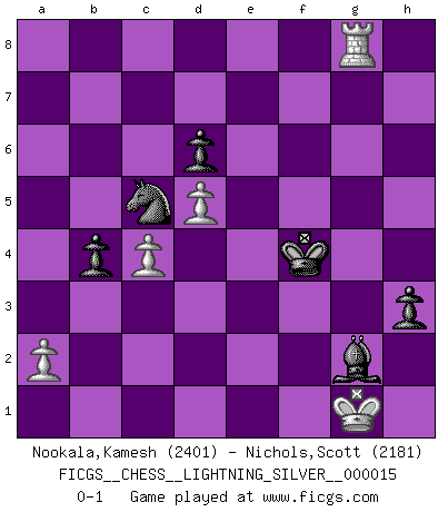 Last move : 0-1 2010 April 25 13:40:5 [Event "FICGS__CHESS__LIGHTNING_SILVER__000015"] [Site "FICGS"] [Date "2010.04.25"] [Round "1"] [White "Nookala,Kamesh"] [Black "Nichols,Scott"] [Result "0-1"] [WhiteElo "2401"] [BlackElo "2181"] 1.e4 d6 2.d4 Nf6 3.Nc3 g6 4.Be3 Bg7 5.f3 c6 6.Qd2 b5 7.g4 h5 8.g5 Nfd7 9.f4 b4 10.Nd1 c5 11.Nf3 Bb7 12.d5 O-O 13.Nh4 a5 14.Be2 Qe8 15.c4 bxc3 16.Nxc3 Nb6 17.Nb5 Ba6 18.Nc7 Qa4 19.Nxa8 Nxa8 20.b3 Qxe4 21.Bf3 Qb4 22.Qxb4 axb4 23.O-O-O Nd7 24.Be4 c4 25.Rd2 Bc3 26.Rf2 Rc8 27.Kb1 f5 28.Nxg6 fxe4 29.Nxe7+ Kf7 30.Nxc8 Bxc8 31.bxc4 Nab6 32.Bd2 Bxd2 33.Rxd2 Nc5 34.Rd4 Nba4 35.Re1 Bf5 36.Re3 Nd3 37.Kc2 Nac5 38.Rg3 Nxf4 39.Kd2 h4 40.Rg1 Kg6 41.Ke3 Nfd3 42.h3 Ne5 43.Rh1 Kxg5 44.Rh2 Kf6 45.Rf2 Nf3 46.Rxf3 exf3 47.Kxf3 Kg5 48.Rd1 Bxh3 49.Rg1+ Kf5 50.Rg8 Bf1 51.Rf8+ Ke5 52.Ke3 Bg2 53.Re8+ Kf6 54.Kf2 h3 55.Kg1 Kg5 56.Rb8 Kh4 57.Rh8+ Kg4 58.Rd8 Kg3 59.Rg8+ Kf4 0-1 Pirc defense Kingside Castling by player Black (move 12) Queenside Castling by player White (move 23) Player Black won this chess game. Follow this game move after move (download)Dazzling combinations are for the many, shifting wood is for the few. (Georg Kieninger) Schach ist das schnellste Spiel der Welt, weil man in jeder Sekunde Tausende von Gedanken ordnen muß. (Albert Einstein) Aquel que ve no otra dirección en el juego que la de dar Jaque Mate a su oponente, nunca será un buen jugador de Ajedrez. (Euwe) Horreur, mais aussi harmonie suprême : qu'y avait-il en effet au monde en dehors des échecs ? Le brouillard, l'inconnu, le non-être... (Vladimir Nabokov) War is the child of passion, passion is the child of narcissism and narcissism is the child. (...) Another game ? (Thibault de Vassal)