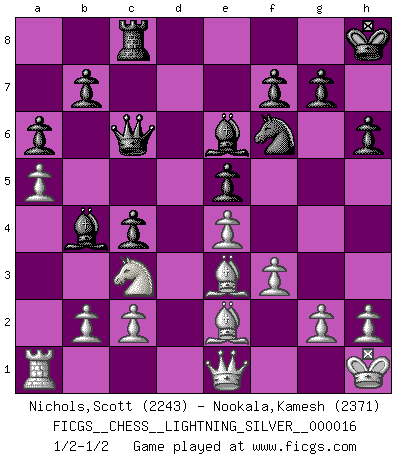 Last move : 1/2-1/2 2010 April 25 18:46:28 [Event "FICGS__CHESS__LIGHTNING_SILVER__000016"] [Site "FICGS"] [Date "2010.04.25"] [Round "1"] [White "Nichols,Scott"] [Black "Nookala,Kamesh"] [Result "1/2-1/2"] [WhiteElo "2243"] [BlackElo "2371"] 1.e4 c5 2.Nf3 d6 3.d4 cxd4 4.Nxd4 Nf6 5.Nc3 a6 6.Be2 e5 7.Nb3 Be7 8.O-O O-O 9.Be3 Be6 10.Qd2 Nbd7 11.a4 Rc8 12.a5 Qc7 13.Rfd1 h6 14.f3 Rfd8 15.Kh1 Nc5 16.Nxc5 dxc5 17.Qe1 Rxd1 18.Qxd1 c4 19.Qe1 Bb4 20.Bb6 Qe7 21.Qg3 Kh7 22.Bg1 Rd8 23.Qe1 Qe8 24.Bb6 Rc8 25.Qb1 Qd7 26.Qe1 Qc6 27.Bf1 Nd7 28.Be3 Kh8 29.Qh4 Bf8 30.Qe1 Be7 31.Qd2 Bb4 32.Qe1 Nf6 33.Bb6 Kh7 34.Be2 Nd7 35.Bg1 Kh8 36.Be3 Nf6 1/2-1/2 Sicilian : Najdorf, Opovcensky variation Kingside Castling by player White (move 8) Kingside Castling by player Black (move 8) This chess game ended in a draw. Follow this game move after move (download)Excellence at Chess is one mark of a scheming mind. (Sir Arthur Conan Doyle) Jeder Fehler erscheint unglaublich dumm, wenn andre ihn begehen. (Georg Christoph Lichtenberg) Un mal día en el Ajedrez, es mejor que cualquier buen día en el trabajo. (Anonymous) L'attaque fait le spectacle, la défense gagne les matchs. (Dicton footballistique) Nobody is always a winner, and anybody who says he is, is either a liar or doesn't play poker. (Amarillo Slim)