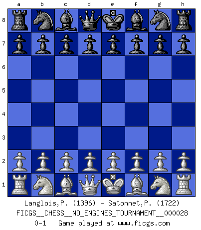 Last move : 0-1 2010 June 7 21:20:52 [Event "FICGS__CHESS__NO_ENGINES_TOURNAMENT__000028"] [Site "FICGS"] [Date "2010.04.25"] [Round "1"] [White "Langlois,Pierrick"] [Black "Satonnet,Patrick"] [Result "0-1"] [WhiteElo "1396"] [BlackElo "1722"] 0-1 This chess game has been lost on time (started : 2010.04.25 23:31:34) Player Black won this chess game. Follow this game move after move (download)I have never in my life played the French Defence, which is the dullest of all openings. (Wilhelm Steinitz) Wer der Ansicht ist, daß alle Schachspieler verrückt sind, wird durch Studium des Lebens von Emil Josef Diemer nicht auf andere Gedanken kommen. (Hans Ree) El Ajedrez tiene tanto misterio como las mujeres. (Purdy) Les échecs, c'est la lutte contre l'erreur. (Johannes Zukertort) Life is like a game of cards: the hand you are dealt represents determinism; the way you play it is free will. (Jawaharlal Nehru)