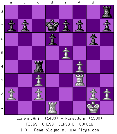 Last move : 1-0 2007 January 27 1:19:39 [Event "FICGS__CHESS__CLASS_D__000016"] [Site "FICGS"] [Date "2006.10.30"] [Round "1"] [White "Elnemr,Amir"] [Black "Acre,John"] [Result "1-0"] [WhiteElo "1400"] [BlackElo "1500"] 1.e4 c5 2.Nf3 d6 3.d4 cxd4 4.Nxd4 Nf6 5.Nc3 g6 6.Be2 Bg7 7.O-O Nc6 8.Bb5 Bd7 9.Be3 Ng4 10.Nxc6 Nxe3 11.Nxd8 Nxd1 12.Raxd1 Rxd8 13.Bxd7+ Kxd7 14.f4 Bxc3 15.bxc3 Rc8 16.Rf3 Rc4 17.e5 1-0 Sicilian : Dragon variation Kingside Castling by player White (move 7) Player White won this chess game. Follow this game move after move (download)The laws of Chess do not permit a free choice: you have to move whether you like it or not. (Emanuel Lasker) Moralische Siege zählen nicht. (Savielly Grigorievitsch Tartakower) ¿Cual es el objetivo de jugar una apertura de gambito?... Para adquirir una reputación de ser un jugador apuesto a costo de perder el juego. (Siegbert Tarrasch) Ce n'est pas pour s'amuser qu'il joue aux échecs : il célèbre un culte. (Vladimir Nabokov) Bobby never cared about money, though. His only desire was to prove that his choices were correct: He wanted chess to be important because he was a chess player, and he wanted to be important. Bobby knew money was important, but he didn't have a clue why, outside of clothes and status. The only way he could accomplish what he wanted was to fight for a lot of money. Once he got it, he gave it away. He did not know how to spend it. And once he'd become champion, after, essentially, sacrificing his life for it, he didn't know how to spend his time. (Bob Wade)