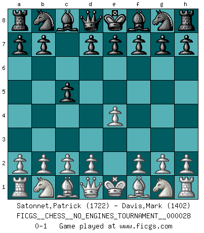 Last move : 0-1 2010 June 8 9:22:31 [Event "FICGS__CHESS__NO_ENGINES_TOURNAMENT__000028"] [Site "FICGS"] [Date "2010.04.25"] [Round "1"] [White "Satonnet,Patrick"] [Black "Davis,Mark"] [Result "0-1"] [WhiteElo "1722"] [BlackElo "1402"] 1.e4 c5 0-1 This chess game has been lost on time (started : 2010.04.25 23:31:34) Sicilian defense Player Black won this chess game. Follow this game move after move (download)When you don't know what to do, wait for your opponent to get an idea - it's sure to be wrong. (Tarrasch) Die starken Figuren des Gegners muss man abtauschen. (José Raúl Capablanca) Fischer es una tragedia del Ajedrez Americano a la par con Morphy y Pillsbury. (Mig Greengard) Un millionnaire : 'Monsieur Steinitz ! Vous ne participez aux tournois que pour l'argent, alors que moi je n'y viens que pour l'honneur.' Steinitz : 'Chacun joue pour ce qu'il n'a pas'... Have no fear of perfection - you'll never reach it. (Salvador Dali)