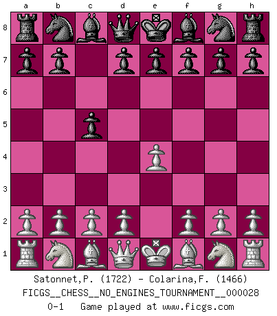 Last move : 0-1 2010 June 10 21:28:55 [Event "FICGS__CHESS__NO_ENGINES_TOURNAMENT__000028"] [Site "FICGS"] [Date "2010.04.25"] [Round "1"] [White "Satonnet,Patrick"] [Black "Colarina,Floram"] [Result "0-1"] [WhiteElo "1722"] [BlackElo "1466"] 1.e4 c5 0-1 This chess game has been lost on time (started : 2010.04.25 23:31:34) Sicilian defense Player Black won this chess game. Follow this game move after move (download)I have never in my life played the French Defence, which is the dullest of all openings. (Wilhelm Steinitz) Im Schach gibt es keinen Platz für Galanterie. (Irving Chernev) Nunca nadie ha ganado una partida de Ajedrez rindiendose. (Unknown) La menace est plus forte que l'exécution. (Aaron Nimzovitch) There are 10 types of people in this world: those who understand binary and those who don't. (Anonymous)