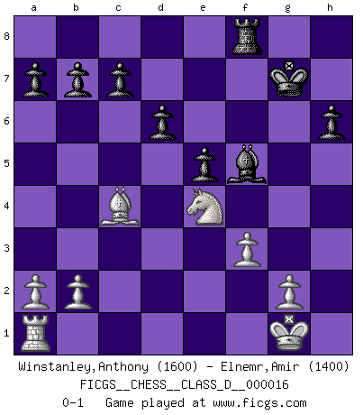 Last move : 0-1 2007 February 10 3:38:7 [Event "FICGS__CHESS__CLASS_D__000016"] [Site "FICGS"] [Date "2006.10.30"] [Round "1"] [White "Winstanley,Anthony"] [Black "Elnemr,Amir"] [Result "0-1"] [WhiteElo "1600"] [BlackElo "1400"] 1.e4 e5 2.Nf3 Nc6 3.Bc4 Bc5 4.c3 Nf6 5.d3 d6 6.h3 O-O 7.O-O Bd7 8.Bg5 h6 9.Bh4 Qe7 10.d4 exd4 11.cxd4 Bxd4 12.Nxd4 Qxe4 13.Bxf6 gxf6 14.Nxc6 Bxc6 15.Qg4+ Qxg4 16.hxg4 Rae8 17.Nc3 Re5 18.Rfe1 Bd7 19.Rxe5 fxe5 20.Ne4 Kg7 21.f3 f5 22.gxf5 Bxf5 0-1 Giuoco Piano Kingside Castling by player Black (move 6) Kingside Castling by player White (move 7) Player Black won this chess game. Follow this game move after move (download)I know people who have all the will in the world, but still can't play good Chess. (Bobby Fischer) Er war ein guter Schachspieler, aber ich kann Leute nicht ausstehen, die 'Heil Hitler' rufen (Über Alexander Aljechin). (Miguel Najdorf) Cuando veas una buena jugada, trata de encontrar otra mejor. (Emanuel Lasker) Votre prénom est 'Tactique', votre deuxième prénom est 'Tactique' et votre nom est 'Tactique'. (Ken Smith) Art is the only way to run away without leaving home. (Twyla Tharp)