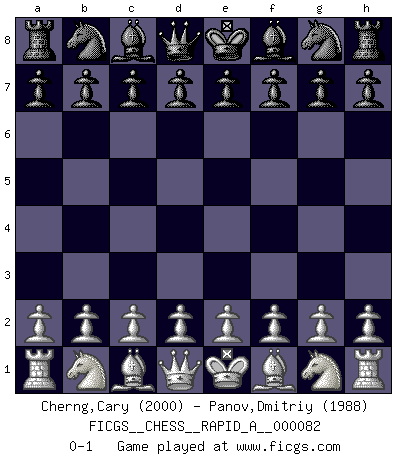 Last move : 0-1 2010 May 28 20:45:21 [Event "FICGS__CHESS__RAPID_A__000082"] [Site "FICGS"] [Date "2010.04.28"] [Round "1"] [White "Cherng,Cary"] [Black "Panov,Dmitriy"] [Result "0-1"] [WhiteElo "2000"] [BlackElo "1988"] 0-1 This chess game has been lost on time (started : 2010.04.28 11:10:48) Player Black won this chess game. Follow this game move after move (download)At this time Fischer is simply a level above all the best Chessplayers in the world. (John Jacobs) Obwohl ich vom Stil her kaum zu den Priestern der Schachkunst gezählt werde, halte ich Schach doch für eine Kunst. (Tigran Petrosjan) El poder defensivo de una pieza clavada, solamente es imaginario. (Aaron Nimzovich) La solitude du joueur d'Echecs à l'approche du mat est semblable à celle du condamné. (Francis Szpiner) Either move or be moved. (Ezra Pound)