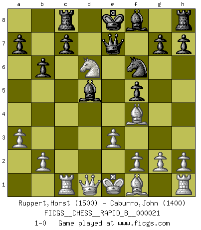 Last move : 1-0 2006 November 7 4:15:51 [Event "FICGS__CHESS__RAPID_B__000021"] [Site "FICGS"] [Date "2006.10.31"] [Round "1"] [White "Ruppert,Horst"] [Black "Caburro,John"] [Result "1-0"] [WhiteElo "1500"] [BlackElo "1400"] 1.d4 b6 2.c4 Bb7 3.Nc3 e6 4.a3 f5 5.d5 exd5 6.cxd5 Nf6 7.Bf4 d6 8.Nf3 Nbd7 9.e3 Qe7 10.Nd4 Nxd5 11.Nxd5 Bxd5 12.Nb5 Nf6 13.Rc1 Rc8 14.Nxd6+ 1-0 Queen's pawn : English defense Player White won this chess game. Follow this game move after move (download)The combination player thinks forward; he starts from the given position, and tries the forceful moves in his mind. (Emanuel Lasker) Mit sehr nachdenklichem Gesicht schreitet Bobby durch den Turniersaal. Was ist passiert?, fragt Lombardy. Ich stehe schlecht, antwortet Fischer. Lombardy: Dann biete doch einfach Remis an. Fischer: So schlecht stehe ich nun auch wieder nicht! (Robert James Fischer) Me dio la sensación de como si yo estuviera jugando en contra del mismo Ajedrez. - al estar jugando en contra de Robert Fischer (Walter Shipman) Je menace de comprendre la position. (Anonyme) Kids, you tried your best and you failed miserably. The lesson is, never try. (Simpsons)