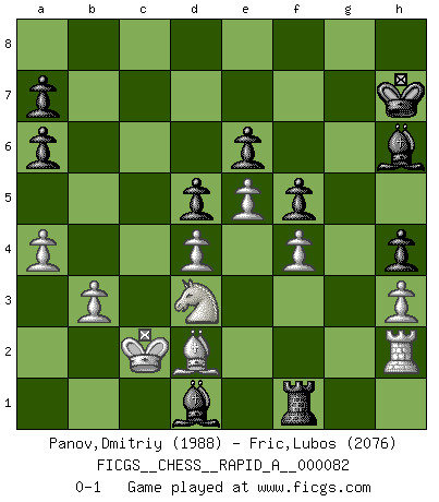 Last move : 0-1 2010 September 28 9:16:10 [Event "FICGS__CHESS__RAPID_A__000082"] [Site "FICGS"] [Date "2010.04.28"] [Round "1"] [White "Panov,Dmitriy"] [Black "Fric,Lubos"] [Result "0-1"] [WhiteElo "1988"] [BlackElo "2076"] 1.e4 e6 2.d4 d5 3.e5 c5 4.c3 Nc6 5.Nf3 Bd7 6.Bd3 cxd4 7.cxd4 Qb6 8.Bc2 Nb4 9.O-O Nxc2 10.Qxc2 Ne7 11.Nc3 Nf5 12.Qd3 Be7 13.Bd2 Rc8 14.b3 h5 15.Rfc1 O-O 16.h3 h4 17.Rcb1 Qa6 18.Qxa6 bxa6 19.Nd1 Kh7 20.Ne3 Nxe3 21.Bxe3 Kg6 22.Bd2 Bb5 23.Ne1 Rb8 24.a4 Bd7 25.Nd3 Rfc8 26.Rb2 Rb7 27.R1a2 f6 28.Ra1 Rcb8 29.Bf4 f5 30.Nc1 Rb4 31.Rd2 Kh5 32.Rd3 g5 33.Bd2 R4b7 34.Ra2 Rc7 35.Ne2 Be8 36.f4 Rcb7 37.Nc1 g4 38.Kf2 Bd8 39.Rc2 Kg6 40.Ke3 Be7 41.Ra2 gxh3 42.gxh3 Bd8 43.Be1 Kh5 44.Rg2 Be7 45.Ra2 Bf8 46.Ba5 Rc8 47.Rc3 Rxc3+ 48.Bxc3 Rg7 49.Rh2 Rg3+ 50.Kd2 Bh6 51.Nd3 Kg6 52.Kc2 Rf3 53.Bd2 Kg7 54.Ne1 Rf1 55.Rg2+ Kh7 56.Nd3 Bh5 57.Rh2 Bd1+ 0-1 This chess game has been lost on time (started : 2010.04.28 11:10:48) French : Advance, Euwe variation Kingside Castling by player White (move 9) Kingside Castling by player Black (move 15) Player Black won this chess game. Follow this game move after move (download)Robert Fischer is a law unto himself. (Larry Evans) Ich suche im Schach immer etwas Eigenes. Riskantes Spiel im Stile schachlicher Musketiere ist nicht meine Sache, auch wenn es vielen Freunden scharfer Wendungen gefällt. (Anatoly Karpov) Si yo gano un torneo, yo lo gano por mí mismo. Yo hago las jugadas. Nadie me ayuda. (Bobby Fischer) La victoire dans une partie d'Echecs appartient la plupart du temps à celui qui voit un peu plus loin que l'adversaire. (Lasker) Luck is when opportunity knocks and you answer. (Anonymous)