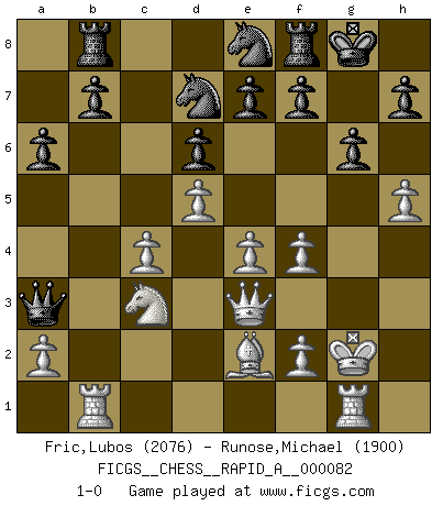 Last move : 1-0 2010 July 23 21:39:14 [Event "FICGS__CHESS__RAPID_A__000082"] [Site "FICGS"] [Date "2010.04.28"] [Round "1"] [White "Fric,Lubos"] [Black "Runose,Michael"] [Result "1-0"] [WhiteElo "2076"] [BlackElo "1900"] 1.d4 Nf6 2.c4 g6 3.Nc3 Bg7 4.e4 d6 5.Be2 O-O 6.Nf3 Bg4 7.Be3 Nfd7 8.Rc1 c5 9.d5 Qb6 10.Qd2 Qb4 11.O-O Bxf3 12.gxf3 Na6 13.h4 Nc7 14.Kg2 Ne8 15.f4 Kh8 16.Rg1 Rb8 17.Qc2 a6 18.h5 Bd4 19.Qd3 Qxb2 20.Bxd4+ cxd4 21.Qxd4+ Kg8 22.Rb1 Qa3 23.Qe3 1-0 This chess game has been lost on time (started : 2010.04.28 11:10:48) King's Indian : 5.Be2 Kingside Castling by player Black (move 5) Kingside Castling by player White (move 11) Player White won this chess game. Follow this game move after move (download)A strong memory, concentration, imagination, and a strong will is required to become a great Chess player. (Bobby Fischer) Vielleicht wirkt die Aura früherer Spieler glanzvoller als die der heutigen Spieler, aber das liegt daran, dass man kein Programm wie Fritz hatte, das einem all die Löcher in ihren Partien zeigt. (Vladimir Kramnik) Después de una mala apertura, hay una esperanza en el juego medio. Pero una vez que estas en finales, el momento de la verdad ha llegado. (Edmar Mednis) Mais n'est-ce pas déjà le limiter injurieusement que d'appeler les échecs un jeu? N'est-ce pas aussi une science, un art, ou quelque chose qui, comme le cercueil de Mahomet entre ciel et terre, est suspendu entre l'un et l'autre, et qui réunit un nombre incroyable de contraires ? (Stefan Zweig) Don't be irreplaceable, if you can't be replaced, you can't be promoted. (Dan Rotaru)