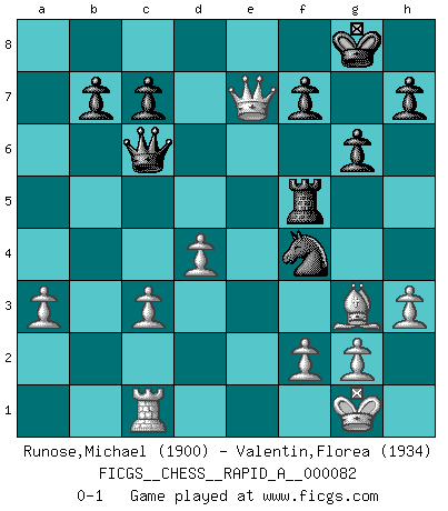 Last move : 0-1 2010 August 7 22:13:57 [Event "FICGS__CHESS__RAPID_A__000082"] [Site "FICGS"] [Date "2010.04.28"] [Round "1"] [White "Runose,Michael"] [Black "Valentin,Florea"] [Result "0-1"] [WhiteElo "1900"] [BlackElo "1934"] 1.e4 e5 2.Nf3 Nf6 3.Nxe5 d6 4.Nf3 Nxe4 5.d4 d5 6.Bd3 Nc6 7.O-O Be7 8.c4 Nb4 9.Be2 O-O 10.Nc3 Bf5 11.a3 Nxc3 12.bxc3 Nc6 13.Re1 Re8 14.Bf4 dxc4 15.Bxc4 Bd6 16.Rxe8+ Qxe8 17.Nh4 Na5 18.Nxf5 Nxc4 19.Qf3 Rb8 20.Bh6 g6 21.Nxd6 Nxd6 22.Qf6 Nf5 23.Bf4 Qd8 24.Qe5 Ng7 25.h3 Qd7 26.Qa5 Ne6 27.Bg3 Rd8 28.Qxa7 Qc6 29.Qa5 Rd5 30.Qb4 Rb5 31.Qe7 Rf5 32.Rc1 Nf4 0-1 This chess game has been lost on time (started : 2010.04.28 11:10:48) Petrov : Classical attack Kingside Castling by player White (move 7) Kingside Castling by player Black (move 9) Player Black won this chess game. Follow this game move after move (download)Whoever sees no other aim in the game than that of giving checkmate to one's opponent will never become a good Chess player. (Euwe) Ich liebe den Moment, wenn ich das Ego meines Gegenüber breche. (Robert James Fischer) Si no le temes a Spassky, entonces elimino el elemento del dinero. (Jim Slater) Echiquier : carré parfait, comme la Jérusalem nouvelle décrite par l'auteur de l'Apocalypse, huit cases sur huit, exaltation du chiffre 4, symbole du cosmos aux quatre horizons... où le noir et le blanc, l'ombre et la lumière, le mal et le bien s'entremêlent et se conjuguent. (Robert Couffignal, Le Gambit du poète) A clear conscience is usually the sign of a bad memory. (Unknown)