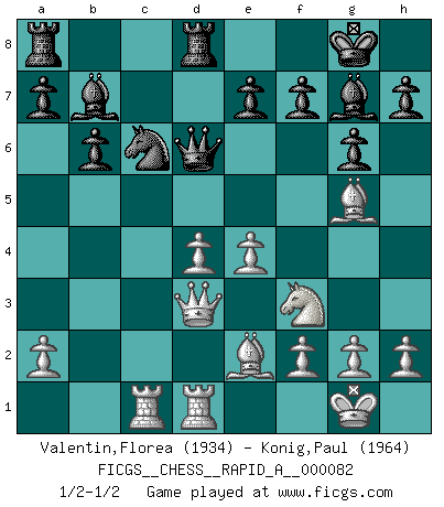 Last move : 1/2-1/2 2010 June 5 7:13:13 [Event "FICGS__CHESS__RAPID_A__000082"] [Site "FICGS"] [Date "2010.04.28"] [Round "1"] [White "Valentin,Florea"] [Black "Konig,Paul"] [Result "1/2-1/2"] [WhiteElo "1934"] [BlackElo "1964"] 1.d4 Nf6 2.c4 g6 3.Nc3 d5 4.cxd5 Nxd5 5.e4 Nxc3 6.bxc3 Bg7 7.Nf3 O-O 8.Be2 c5 9.O-O cxd4 10.cxd4 b6 11.Bg5 Bb7 12.Qd3 Nc6 13.Rfd1 Qd6 14.Rac1 Rfd8 1/2-1/2 King's Indian defense, 3.Nc3 Kingside Castling by player Black (move 7) Kingside Castling by player White (move 9) This chess game ended in a draw. Follow this game move after move (download)Chess is a fighting game which is purely intellectual and includes chance. (Richard Reti) Ich glaube nicht an Psychologie, ich glaube an gute Züge. (Robert James Fischer) Por la belleza de sus partidas, la claridad de su juego y lo brillante de sus ideas, Fischer se creó el mismo como un artista de la misma estatura como Brahms, Rembrandt y Shakespeare. (David Levy) Le système Elo représente seulement une moyenne. Il est simplement un indicateur de votre stabilité. (Anatoli Karpov) Strategy without tactics is the slowest route to victory. Tactics without strategy is the noise before defeat. (Sun Tzu)