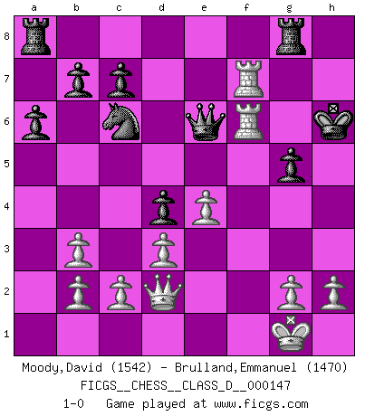 Last move : 1-0 2010 May 10 14:58:59 [Event "FICGS__CHESS__CLASS_D__000147"] [Site "FICGS"] [Date "2010.04.28"] [Round "1"] [White "Moody,David"] [Black "Brulland,Emmanuel"] [Result "1-0"] [WhiteElo "1542"] [BlackElo "1470"] 1.Nc3 d5 2.e4 d4 3.Nce2 e5 4.Ng3 Nf6 5.Nf3 Bd6 6.Bc4 h6 7.O-O O-O 8.d3 Re8 9.Nh4 Be6 10.Bb3 Bxb3 11.axb3 a6 12.Nhf5 Nc6 13.Nh5 Bf8 14.f4 g6 15.Nxf6+ Qxf6 16.fxe5 Qxe5 17.Nxh6+ Bxh6 18.Bxh6 Kh7 19.Rxf7+ Kxh6 20.Qd2+ g5 21.Raf1 Rg8 22.R1f5 Qe6 23.R5f6+ 1-0 Dunst (Sleipner, Heinrichsen) Opening Kingside Castling by player White (move 7) Kingside Castling by player Black (move 7) Player White won this chess game. Follow this game move after move (download)I know people who have all the will in the world, but still can't play good Chess. (Bobby Fischer) Ich war zu klein für die Schach-Schülermannschaft! (Woody Allen) El Ajedrez es el juego mas altamente simbólico, pero las agresiones estan por lo tanto aún mas francamente representadas en la partida. Tal vez comenzo como un juego de guerra; Algo como la representación de una batalla en miniatura entre las fuerzas de dos reinos. (Karl Meninger) Vous savez, camarade Pachman, je n'éprouve pas de plaisir à être ministre, je jouerais plutôt aux échecs comme vous, ou alors ferais une révolution au Venezuela. (Che Guevara à Ludek Pachman, 'Checkmate in Prague', 1975) Art is the only way to run away without leaving home. (Twyla Tharp)