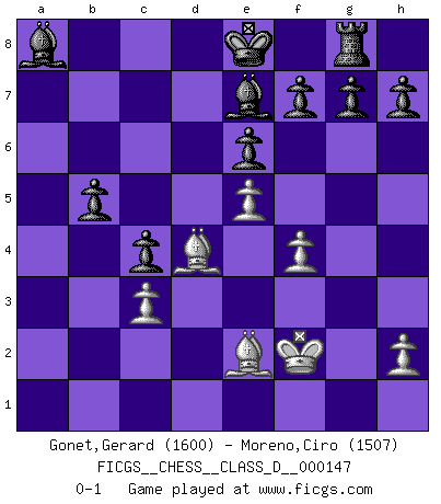 Last move : 0-1 2010 April 30 21:43:56 [Event "FICGS__CHESS__CLASS_D__000147"] [Site "FICGS"] [Date "2010.04.28"] [Round "1"] [White "Gonet,Gerard"] [Black "Moreno,Ciro"] [Result "0-1"] [WhiteElo "1600"] [BlackElo "1507"] 1.f4 Nf6 2.c4 e6 3.d4 d5 4.a3 dxc4 5.Nc3 a6 6.e4 b5 7.Nf3 c5 8.e5 Nd5 9.Be2 Nxc3 10.bxc3 Bb7 11.a4 Nc6 12.axb5 axb5 13.Be3 Rxa1 14.Qxa1 cxd4 15.Nxd4 Nxd4 16.Bxd4 Bxg2 17.Rg1 Be4 18.Qa6 Qd7 19.Kf2 Qb7 20.Qa2 Rg8 21.Ra1 Be7 22.Qa8+ Qxa8 23.Rxa8+ Bxa8 0-1 Bird's Opening Player Black won this chess game. Follow this game move after move (download)After a bad opening, there is hope for the middle game. After a bad middle game, there is hope for the endgame. But once you are in the endgame, the moment of truth has arrived. (Edmar Mednis) Die westlichen Werte sind eine Sprache, welche die Putin-Administration nicht versteht. (Garry Kasparov) El Ajedrez se juega con la mente... ¡no con las manos!. (Renaud y Kahn) Les erreurs sont comme les malheurs, elles n'arrivent jamais seules. (Siegbert Tarrasch) They misunderestimated me. (George W. Bush, Bentonville nov. 6, 2000)