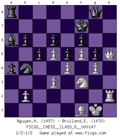 Last move : 1/2-1/2 2010 May 19 15:34:26 [Event "FICGS__CHESS__CLASS_D__000147"] [Site "FICGS"] [Date "2010.04.28"] [Round "1"] [White "Nguyen,Hao Nhien"] [Black "Brulland,Emmanuel"] [Result "1/2-1/2"] [WhiteElo "1497"] [BlackElo "1470"] 1.c4 c5 2.Nf3 g6 3.Nc3 Bg7 4.g3 d6 5.Bg2 Nf6 6.O-O O-O 7.d3 e5 8.Rb1 a5 9.Ne1 Nc6 10.Bd2 Re8 11.Qc1 Nd4 12.e3 Nc6 13.f4 Bf5 14.e4 Bg4 15.h3 Be6 16.f5 Bd7 17.g4 Bc8 18.Nd5 Nxd5 19.cxd5 Nd4 20.Bg5 f6 21.Bh6 g5 22.Bxg7 Kxg7 23.Nf3 b6 24.Qe1 Nc2 25.Qf2 Nb4 26.Rbd1 Nxa2 27.h4 h6 28.hxg5 hxg5 29.Qg3 Nb4 30.Rf2 Rh8 31.Bf1 Ba6 32.Rh2 Rxh2 33.Qxh2 Qh8 34.Qg3 a4 35.Rd2 Qh7 36.Rh2 Qg8 37.Qh3 Kf7 38.Qh5+ Kf8 39.Qh6+ Kf7 40.Qh5+ Kf8 41.Qh6+ Kf7 42.Qh5+ 1/2-1/2 English : Symmetrical variation Kingside Castling by player White (move 6) Kingside Castling by player Black (move 6) This chess game ended in a draw. Follow this game move after move (download)Castle early and often. (Rob Sillars) Frage: Wie viele Autos haben Sie schon zerstört? - Antwort: Nur zwei. (Loek van Wely) El Ajedrez es un terrible juego. Si no controlas el centro, tu oponente tiene una posición mas holgada. Si tienes control del centro, ¡entonces realmente tu tienes algo de que preocuparte!. (Siegbert Tarrasch) RxDa4 pat (...) The problem with manipulation is that people can turn on you. (Horatio Caine, C.S.I. Miami)