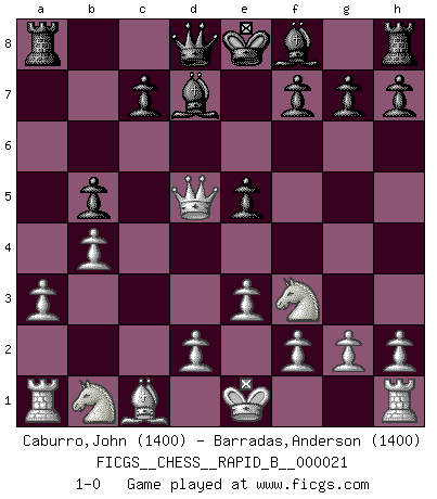 Last move : 1-0 2006 December 15 12:31:6 [Event "FICGS__CHESS__RAPID_B__000021"] [Site "FICGS"] [Date "2006.10.31"] [Round "1"] [White "Caburro,John"] [Black "Barradas,Anderson"] [Result "1-0"] [WhiteElo "1400"] [BlackElo "1400"] 1.a3 e5 2.c4 Nf6 3.e3 d5 4.cxd5 Nxd5 5.Bc4 Be6 6.Qc2 a6 7.Nf3 Nc6 8.b4 b5 9.Bxb5 axb5 10.Qxc6+ Bd7 11.Qxd5 1-0 This chess game has been lost on time (started : 2006.10.31 23:12:19) Anderssen's Opening Player White won this chess game. Follow this game move after move (download)Weak points or holes in the opponent's position must be occupied by pieces not Pawns. (Siegbert Tarrasch) Schach wird sich dank seiner hohen kulturellen Tradition immer durchsetzen. In näherer Zukunft womöglich sogar als Gegenreaktion auf die maßlose Reizüberflutung im Freizeit- und Spielbereich. (Garry Kasparov) En el Ajedrez, tal como en la vida, las bendiciones de hoy pueden ser el veneno del mañana. (Assaic) La conception d'un plan est le processus par lequel un joueur exploite les avantages de sa position tout en s'efforçant d'en réduire au minimum les inconvénients. Afin de garantir le succès, un plan doit toujours se fonder sur un diagnostic objectif des particularités d'une position. La conception d'un plan est d'autant plus difficile que la position est équilibrée, et grandement facilitée lorsqu'il n'existe qu'un seul plan susceptible de répondre aux exigences de la position. (Harry Golombek) Methinks King Thibault should dub Marius Zubac a knight of the square board... I mean table, henceforth addressing him as Sir Marius, and bestow on him a suitable land from the kingdom of FICGS & marry him off to a worthy, fair maiden, lest he slice our heads with his mighty sword in his wrath. (Dinesh De Silva)