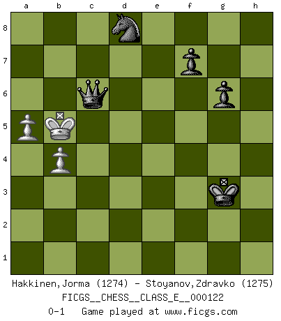 Last move : 0-1 2010 May 7 14:22:58 [Event "FICGS__CHESS__CLASS_E__000122"] [Site "FICGS"] [Date "2010.04.28"] [Round "1"] [White "Hakkinen,Jorma"] [Black "Stoyanov,Zdravko"] [Result "0-1"] [WhiteElo "1274"] [BlackElo "1275"] 1.d4 d5 2.c4 e6 3.a3 c5 4.Nf3 h6 5.cxd5 Qxd5 6.Nc3 Qf5 7.e4 Qf6 8.Be2 cxd4 9.Qxd4 Qxd4 10.Nxd4 Bc5 11.Be3 e5 12.Ndb5 Bxe3 13.fxe3 Na6 14.Nd5 Rb8 15.Nbc7+ Nxc7 16.Nxc7+ Kd7 17.Nb5 a6 18.O-O-O Ke7 19.Nd6 Be6 20.Kb1 Nf6 21.Bf3 Bg4 22.Bxg4 Nxg4 23.Nf5+ Kf8 24.Rd2 g6 25.Nd6 Nxe3 26.Rg1 Kg7 27.g3 Ng4 28.h3 Nf6 29.g4 Rhd8 30.Rgd1 Rf8 31.Nc4 Nxe4 32.Rd7 Nf2 33.Rf1 Nxh3 34.Nxe5 Ng5 35.Ka2 b5 36.b4 Rbe8 37.Nc6 Kh7 38.Rf6 Re6 39.Rxe6 Nxe6 40.Ne5 Ng5 41.Kb3 Kg7 42.Kc3 Kf6 43.Nd3 Ra8 44.Kd4 Ne6+ 45.Kd5 Rd8 46.Rxd8 Nxd8 47.Kc5 Kg5 48.Kb6 Kxg4 49.Kxa6 h5 50.Kxb5 h4 51.a4 Kg3 52.Nc1 h3 53.Ne2+ Kf2 54.Nf4 h2 55.Nh3+ Kg3 56.Ng5 h1Q 57.Ne4+ Qxe4 58.a5 Qc6+ 0-1 Queen's gambit declined Queenside Castling by player White (move 18) 10 pieces endgame at move 49 : White KNPP , Black KNPPPP WHITE : King + 1 Knight 2 Pawns BLACK : King + 1 Knight 4 Pawns 9 pieces endgame at move 50 : White KNPP , Black KNPPP WHITE : King + 1 Knight 2 Pawns BLACK : King + 1 Knight 3 Pawns Promotion Queen by player Black (move 56) 8 pieces endgame at move 57 : White KPP , Black KQNPP WHITE : King + 2 Pawns BLACK : King + 1 Queen 1 Knight 2 Pawns Player Black won this chess game. Follow this game move after move (download)Good positions don't win games, good moves do. (Gerald Abrahams) Wie ich sie so einen nach dem anderen nieder mähte wurde meine Überlegenheit offensichtlich. (José Raúl Capablanca) El juego de Damas es para vagabundos. (Paul Morphy) Toute estimation doit être constamment réévaluée. (Jacob Estrin) Somehow our devils are never quite what we expect when we meet them face to face. (Nelson DeMille)