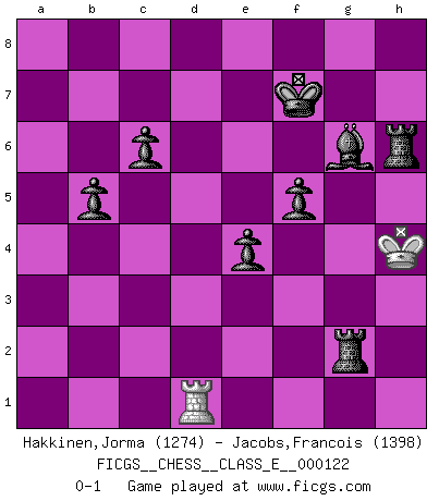 Last move : 0-1 2010 May 4 12:15:22 [Event "FICGS__CHESS__CLASS_E__000122"] [Site "FICGS"] [Date "2010.04.28"] [Round "1"] [White "Hakkinen,Jorma"] [Black "Jacobs,Francois"] [Result "0-1"] [WhiteElo "1274"] [BlackElo "1398"] 1.d4 d5 2.c4 e6 3.a3 Nf6 4.Nf3 Be7 5.Bg5 c6 6.c5 Nbd7 7.e3 O-O 8.Bd3 Qc7 9.O-O e5 10.dxe5 Nxe5 11.Nxe5 Qxe5 12.Bf4 Qxb2 13.Nd2 Bxc5 14.Qc2 Bxa3 15.Qxb2 Bxb2 16.Rab1 Ba3 17.Rb3 Be7 18.Rfb1 Nd7 19.h3 Nc5 20.Rc3 Nxd3 21.Rxd3 Bf5 22.e4 dxe4 23.Re3 b5 24.g4 Bg6 25.Nb3 a5 26.Nd4 Rfc8 27.h4 Bxh4 28.g5 h6 29.gxh6 Bf6 30.Ne2 a4 31.hxg7 a3 32.Nc3 a2 33.Nxa2 Rxa2 34.Kg2 Bxg7 35.Kg3 Bd4 36.R3e1 Bxf2+ 37.Kg4 Bxe1 38.Rxe1 f5+ 39.Kg5 Kf7 40.Rd1 Rg2+ 41.Kh4 Rh8+ 42.Bh6 Rxh6+ 0-1 Queen's gambit declined Kingside Castling by player Black (move 7) Kingside Castling by player White (move 9) 10 pieces endgame at move 42 : White KR , Black KRRBPPPP WHITE : King + 1 Rook BLACK : King + 2 Rooks 1 Bishop 4 Pawns Player Black won this chess game. Follow this game move after move (download)By playing at Chess then, we may learn: First: Foresight... Second: Circumspection... Third: Caution... And lastly, we learn by Chess the habit of not being discouraged by present bad appearances in the state of our affairs, the habit of hoping for a favorable chance, and that of persevering in the secrets of resources. (Benjamin Franklin) Es ist besser die Steine des Gegners zu opfern. (Savielly Grigorievitsch Tartakower) Si el Ajedrez es una ciencia, es la mas inexacta. Si el Ajedrez es un arte, es demasiado inexacto para ser visto como tal. Si el Ajedrez es un deporte, es demasiado esotérico. Si el Ajedrez es un juego, es demasiado exigente para ser solo un juego. Si el Ajedrez es una aventura, es una muy demandante. Si el Ajedrez es una pasión, es una muy gratificante. Si el Ajedrez es la vida, es una muy triste. (Anónimo) Karpov est une pièce de musée. (Garry Kasparov) Are you threatening me, Master Jedi ? (Chancellor Palpatine in Star Wars ep.3)