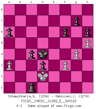 Last move : 0-1 2010 May 6 12:56:25 [Event "FICGS__CHESS__CLASS_E__000122"] [Site "FICGS"] [Date "2010.04.28"] [Round "1"] [White "Chhawchharia,Gaurav"] [Black "Hakkinen,Jorma"] [Result "0-1"] [WhiteElo "1206"] [BlackElo "1274"] 1.e4 e5 2.Nc3 Nc6 3.a3 Nf6 4.d3 Be7 5.Nf3 O-O 6.Be2 d6 7.O-O Bg4 8.h3 Bxf3 9.Bxf3 a6 10.Bg5 Re8 11.Bxf6 Bxf6 12.Nd5 Nd4 13.c3 Nxf3+ 14.Qxf3 c6 15.Ne3 b5 16.d4 exd4 17.cxd4 Bxd4 18.Rab1 Bxe3 19.Qxe3 d5 20.Rbd1 Rxe4 21.Qc5 Qf6 22.f3 Rc4 23.Qb6 h6 24.Rb1 Qd4+ 25.Qxd4 Rxd4 26.Rfd1 Rxd1+ 27.Rxd1 Rd8 28.Kh2 f6 29.g4 Kf7 30.Kg3 d4 31.Rd3 c5 32.b3 c4 33.bxc4 bxc4 34.Rd1 d3 35.Kf2 Ke6 36.Ke1 Kd5 37.Kd2 Kd4 38.Rc1 Re8 39.h4 Re2+ 40.Kd1 Rh2 41.h5 Rh1+ 42.Kd2 Rxc1 0-1 Vienna game, Max Lange defense Kingside Castling by player Black (move 5) Kingside Castling by player White (move 7) Player Black won this chess game. Follow this game move after move (download)The game of chess is the touchstone of the intellect. (Goethe) Das Schach ist nichts für kleine Geister, es beansprucht einen vollen Mann, der sich nicht sklavisch an das Überlieferte hält, sondern selbständig die Tiefen des Spiels zu ergründen sucht. (Wilhelm Steinitz) Realmente no sabemos como el juego fue inventado, aunque hay sospechas. Tan pronto como descubramos a los culpables, se los haremos saber. (Bruce Pandolfini) La vie est comme un jeu d'échecs : nous esquissons un plan, mais celui-ci est tributaire de ce que daignent faire l'adversaire aux échecs et le destin dans la vie. (Arthur Schopenhauer) First of all, we have to go back to the classical time control. (Anatoly Karpov)