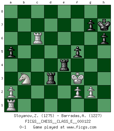 Last move : 0-1 2010 May 6 20:58:29 [Event "FICGS__CHESS__CLASS_E__000122"] [Site "FICGS"] [Date "2010.04.28"] [Round "1"] [White "Stoyanov,Zdravko"] [Black "Barradas,Anderson"] [Result "0-1"] [WhiteElo "1275"] [BlackElo "1227"] 1.e4 c5 2.Nf3 Nc6 3.Bb5 a6 4.Bxc6 bxc6 5.d3 d6 6.h3 Nf6 7.O-O e5 8.Bg5 Be7 9.Nbd2 h6 10.Bh4 Rb8 11.b3 O-O 12.c4 Nh5 13.Bxe7 Qxe7 14.Nh2 Nf4 15.Ng4 Nxd3 16.Ne3 Qg5 17.Nf3 Qg6 18.Qxd3 Bxh3 19.Nh4 Qg5 20.Nef5 Bxf5 21.Nxf5 Rfd8 22.Qg3 Qxg3 23.Nxg3 d5 24.exd5 cxd5 25.Ne2 dxc4 26.bxc4 Rb2 27.Nc3 f5 28.Na4 Rc2 29.Nxc5 Rxc4 30.Nb7 Rd7 31.Na5 Ra4 32.Nb3 Rd5 33.Rfc1 e4 34.Rc6 a5 35.Kh2 Rb4 36.Kg3 Kh7 37.Kf4 e3 38.Kxe3 Re4+ 39.Kf3 Rd3+ 0-1 Sicilian : Nimzovich-Rossolimo attack (without ...d6) Kingside Castling by player White (move 7) Kingside Castling by player Black (move 11) Player Black won this chess game. Follow this game move after move (download)Bobby is the most misunderstood, misquoted celebrity walking the face of this earth. (Yasser Seirawan) Ich möchte Schüler heranbilden, die das Vermögen haben, selbst zu denken und Kritik zu üben. (Emanuel Lasker) De todos mis libros Rusos, la defensa contiene y difunde el 'calor' mas grande que pudiese verse extraño al observar lo supremamente abstracto que el Ajedrez supuestamente es. (Vladimir Nabokov) Roi des jeux et jeu des rois, les échecs portent en eux un sentiment d'infini. Ils donnent à celui qui s'est efforcé d'en approfondir les arcanes l'impression de n'être pas à la mesure de l'homme; en fait, ils constituent un résumé de l'univers, un microcosme, et figurent cette grande échelle qui, dans les plans de la lumière descend jusqu'à la matière, qui des abîmes insondables remonte jusqu'en l'infini de Dieu. (Pyrame) Somewhere in the world there is an epigram for every dilemma. (Hendrik Willem van Loon)