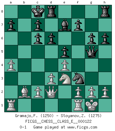 Last move : 0-1 2010 May 5 21:52:51 [Event "FICGS__CHESS__CLASS_E__000122"] [Site "FICGS"] [Date "2010.04.28"] [Round "1"] [White "Gramajo,Francisco"] [Black "Stoyanov,Zdravko"] [Result "0-1"] [WhiteElo "1250"] [BlackElo "1275"] 1.b3 e5 2.Bb2 Qf6 3.Nf3 d6 4.e4 Bg4 5.Be2 Bxf3 6.Bxf3 Nc6 7.O-O O-O-O 8.d3 h6 9.Nc3 Nge7 10.a4 Ng6 11.Nd5 Qg5 12.b4 Nh4 13.b5 Be7 14.bxc6 bxc6 15.Ne3 g6 16.Qd2 Nxf3+ 0-1 Nimzovich-Larsen attack : Modern variation Kingside Castling by player White (move 7) Queenside Castling by player Black (move 7) Player Black won this chess game. Follow this game move after move (download)The older I grow, the more I value Pawns. (Keres) Ich brauche nur einen Blick auf das Schachbrett zu werfen, und weiß schon, was in der Stellung steckt, was geschehen kann und was geschehen wird. Alle übrigen suchen und prüfen, ich aber weiß es! (José Raúl Capablanca) El jugador de combinación piensa hacia adelante; comienza de la posición dada y trabaja las movidas contundentes en su mente. (Emanuel Lasker) Vous n'êtes pas toujours obligé de jouer le meilleur coup. Un coup doit être actif, entreprenant, correct et beau ! (David Bronstein) O divine art of subtlety and secrecy! Through you we learn to be invisible, through you inaudible and hence we can hold the enemy's fate in our hands. (Sun Tzu)