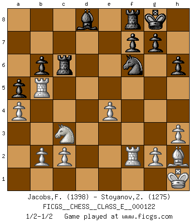 Last move : 1/2-1/2 2010 May 8 15:7:53 [Event "FICGS__CHESS__CLASS_E__000122"] [Site "FICGS"] [Date "2010.04.28"] [Round "1"] [White "Jacobs,Francois"] [Black "Stoyanov,Zdravko"] [Result "1/2-1/2"] [WhiteElo "1398"] [BlackElo "1275"] 1.e4 c5 2.Nf3 Nc6 3.d4 cxd4 4.Nxd4 Nxd4 5.Qxd4 d6 6.Nc3 e5 7.Qd1 h6 8.Be2 Nf6 9.O-O Be7 10.Be3 O-O 11.Kh1 a6 12.a4 a5 13.Qd2 b6 14.f4 exf4 15.Bxf4 Bg4 16.Bxg4 Nxg4 17.h3 Nf6 18.Rad1 Nh5 19.Bh2 Rc8 20.Rf3 Bg5 21.Qxd6 Qxd6 22.Rxd6 Bd8 23.Rd5 Nf6 24.Rb5 Rc6 25.Rf2 1/2-1/2 Sicilian defense Kingside Castling by player White (move 9) Kingside Castling by player Black (move 10) This chess game ended in a draw. Follow this game move after move (download)Chess is really ninety nine percent calculation. (Soltis) Der beste Spieler in einem Turnier gewinnt es nie. Er landet auf Platz zwei oder drei. (Siegbert Tarrasch) ¿Que sería del Ajedrez sin errores graciosos?. (Kurt Richter) Que feriez-vous si vous étiez en train de jouer aux échecs et que la fin du monde arrive ? Je continuerais à jouer. (Saint Borromée) Always remember that you are unique; just like everyone else. (Unknown)
