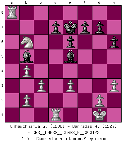 Last move : 1-0 2010 May 3 21:51:18 [Event "FICGS__CHESS__CLASS_E__000122"] [Site "FICGS"] [Date "2010.04.28"] [Round "1"] [White "Chhawchharia,Gaurav"] [Black "Barradas,Anderson"] [Result "1-0"] [WhiteElo "1206"] [BlackElo "1227"] 1.e4 c5 2.d3 e6 3.Nc3 Nc6 4.Nf3 a6 5.Be3 b5 6.a3 Bb7 7.d4 b4 8.Ne2 cxd4 9.Nexd4 Nxd4 10.Qxd4 Rc8 11.Bd3 h6 12.axb4 Nf6 13.c3 Ng4 14.Bxa6 Ra8 15.Qd3 Nxe3 16.fxe3 Qb6 17.Ne5 Bd6 18.Nc4 Bxa6 19.Nxb6 Bxd3 20.Rxa8+ Ke7 21.Rxh8 Bc7 22.Na8 Bd6 23.h3 Bxe4 24.Nb6 Be5 25.O-O Bd3 26.Rd1 Bb5 27.Ra8 1-0 Sicilian defense Kingside Castling by player White (move 25) Player White won this chess game. Follow this game move after move (download)Don't even mention losing to me. I can't stand to think of it. (Bobby Fischer) Ich habe kein Problem mit Frauen, sondern nur mit dem Niveau ihres Schachspiels (Judith Polgar) Fischer sacrificó virtualmente todo lo que la mayoría de nosotros los 'debiles' (término que él usa) valoramos, respetamos y apreciamos por el amor de un astuto, a menudo hermoso tablero de juego, por el privilegio ambivalente de ser su mas grande maestro. (Paul Kollar) Les Echecs représentent une sphère d'idées créatrices basée sur la volonté des deux protagonistes. (Smyslov) Luck is the residue of design. (John Milton)