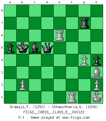 Last move : 0-1 2010 May 16 21:33:26 [Event "FICGS__CHESS__CLASS_E__000122"] [Site "FICGS"] [Date "2010.04.28"] [Round "1"] [White "Gramajo,Francisco"] [Black "Chhawchharia,Gaurav"] [Result "0-1"] [WhiteElo "1250"] [BlackElo "1206"] 1.g3 e5 2.Bg2 Nf6 3.d3 d6 4.Bg5 h6 5.Bxf6 Qxf6 6.e4 Nc6 7.Nc3 Be6 8.Nf3 Be7 9.Ne2 a6 10.O-O Bg4 11.Nc3 Bxf3 12.Bxf3 Nd4 13.Bg2 Qg6 14.Nd5 h5 15.Nxc7+ Kd7 16.Nxa8 Rxa8 17.c3 Ne6 18.Qa4+ b5 19.Qb3 Qg4 20.f3 Qg5 21.d4 h4 22.g4 exd4 23.cxd4 f6 24.a4 Nxd4 25.Qd3 Qc5 26.Rf2 Bd8 27.axb5 a5 28.f4 Bb6 29.e5 Rf8 30.exd6 Qxd6 31.Bh3 g5 32.fxg5 Kc7 33.Rc1+ Bc5 34.g6 Kb6 35.g7 Rg8 36.Rcf1 Rxg7 37.Rxf6 Ne6 38.Kh1 Qxd3 39.Rxe6+ Kxb5 40.Rf3 Qd1+ 41.Rf1 Qd5+ 0-1 Benko's Opening Kingside Castling by player White (move 10) Player Black won this chess game. Follow this game move after move (download)A sacrifice is best refuted by accepting it. (Wilhelm Steinitz) Kasparov stellt für gewöhnlich die Regeln auf und bricht sie dann selbst wieder. (Alexej Shirov) La captura del Rey enemigo es la finalidad pero no el primer objetivo de la partida. (William Steinitz) Botvinnik disait en comparant les échecs à la musique: Il existe une science dont le but est l'étude de l'acoustique et des sons. Mais il y a aussi un art qui se sert de l'océan des sons : c'est la musique. De toute évidence, il en est de même pour la pensée. La logique est l'étude des lois de la réflexion et les échecs reflètent, en tant qu'art, le côté logique de la réflexion, sous la forme d'images artistiques... Extrait de Fischer - Spassky, Reykjavik 1972 par Alexander & F. Wyndham (Ed. Solar), p 37. When it is a question of money, everybody is of the same religion. (Voltaire)