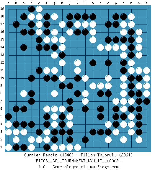 Last move : 1-0 2010 October 16 18:49:20 [Event "FICGS__GO__TOURNAMENT_KYU_II__000021"] [Site "FICGS"] [Date "2010.04.29"] [Round "1"] [Black "Guanter,Renato"] [White "Pillon,Thibault"] [Result "1-0"] [Rating 1 "1548"] [Rating 2 "2061"] 1.d4 q16 2.d16 q4 3.o17 q14 4.k16 f3 5.c6 j4 6.r9 r11 7.r6 o4 8.q18 r17 9.s4 r3 10.c14 q8 11.r8 q6 12.q7 p7 13.q5 r7 14.p6 q7 15.p5 r5 16.s6 r4 17.s7 q9 18.r10 q10 19.q11 s11 20.s5 t8 21.t9 s9 22.s10 t10 23.s8 t9 24.t7 t11 25.q12 s13 26.s3 s2 27.p4 q2 28.n6 p3 29.n5 o10 30.o12 h17 31.j17 h15 32.o15 d2 33.m3 d18 34.f17 c17 35.c16 e17 36.f16 e16 37.e15 f15 38.e14 g16 39.d17 e18 40.f14 g15 41.c18 g18 42.d10 f6 43.h13 o14 44.m12 m9 45.n8 n9 46.o8 o9 47.o3 o2 48.n3 n14 49.f4 g4 50.e3 e2 51.g3 f2 52.h4 g5 53.j3 j5 54.h5 h6 55.h3 c3 56.c4 c8 57.f5 g6 58.d7 l17 59.j18 m15 60.l16 m16 61.m18 m17 62.l18 k17 63.k18 j16 64.j6 k12 65.j7 g8 66.j9 g11 67.d8 h12 68.g10 f11 69.f10 k11 70.e11 b3 71.b4 a4 72.a5 a3 73.b6 l7 74.k8 l8 75.l6 r18 76.p17 g13 77.p15 p14 78.r13 s14 79.r14 s15 80.r15 r12 81.q15 q13 82.k10 l10 83.g14 h14 84.r16 s16 85.d19 e19 86.b17 q17 87.p18 h10 88.h9 j1 89.j2 k1 90.l2 h1 91.g2 g1 92.c1 b2 93.b1 d1 94.f1 a1 95.f18 1-0 Here are the names of the openings (joseki) played in the four corners : Corner q16 : q16 o17 Hoshi (Hwajeom, Seongjeom, Xingwei`) 4-4 Point. The star or hoshi (4-4) point, emphasizing influence at the potential expense of territory. Ikken Kakari (Hankan Keolch'im, Yi Gua`jiao~, 1-Space Low Approach). Black 2 is the standard approach move to the 4-4. Corner d4 : d4 f3 Hoshi (Hwajeom, Seongjeom, Xingwei`) 4-4 Point. The star or hoshi (4-4) point, emphasizing influence at the potential expense of territory. Ikken Kakari (Hankan Keolch'im, Yi Gua`jiao~, 1-Space Low Approach). White 2 is the standard approach move to the 4-4. Corner q4 : q4 r9 Hoshi (Hwajeom, Seongjeom, Xingwei`) 4-4 Point. The star or hoshi (4-4) point, emphasizing influence at the potential expense of territory. Player Black won this Go (weiqi, baduk) game. Follow this game move after move (download)The game plays itself, the players don't control it. (Pierre Audouard) Don't be discouraged. It's often the last key in the bunch that opens the lock. (Author unknown)