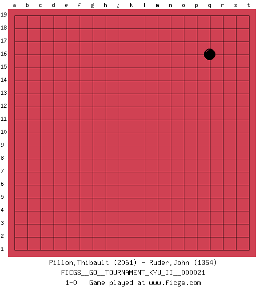 Last move : 1-0 2010 May 29 20:45:59 [Event "FICGS__GO__TOURNAMENT_KYU_II__000021"] [Site "FICGS"] [Date "2010.04.29"] [Round "1"] [Black "Pillon,Thibault"] [White "Ruder,John"] [Result "1-0"] [Rating 1 "2061"] [Rating 2 "1354"] 1.q16 1-0 This go game has been lost on time (started : 2010.04.29 10:44:40) Here are the names of the openings (joseki) played in the four corners : Player Black won this Go (weiqi, baduk) game. Follow this game move after move (download)On the second line six die, eight live. (Anonymous) The large trees attract high winds. (Chinese proverb)