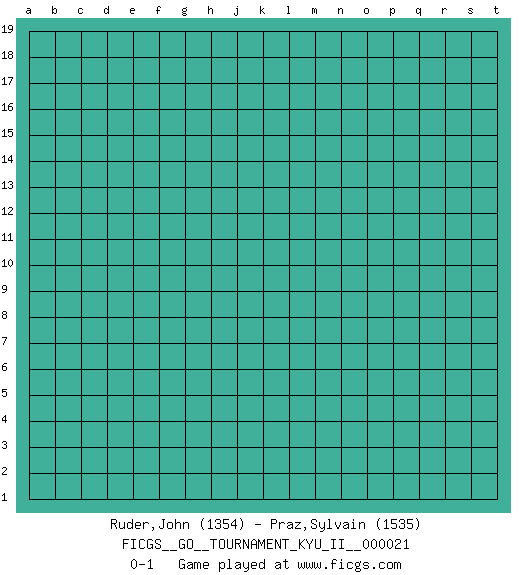 Last move : 0-1 2010 May 29 20:45:59 [Event "FICGS__GO__TOURNAMENT_KYU_II__000021"] [Site "FICGS"] [Date "2010.04.29"] [Round "1"] [Black "Ruder,John"] [White "Praz,Sylvain"] [Result "0-1"] [Rating 1 "1354"] [Rating 2 "1535"] 0-1 This go game has been lost on time (started : 2010.04.29 10:44:40) Here are the names of the openings (joseki) played in the four corners : Player White won this Go (weiqi, baduk) game. Follow this game move after move (download)Don't make territory near thickness. (Anonymous) The question of whether computers can think is just like question of whether submarines can swim. (Edsger W. Dijkstra)