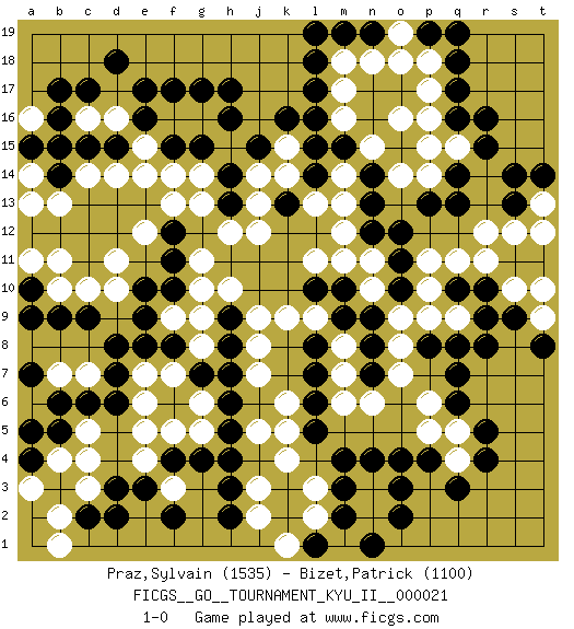 Last move : 1-0 2010 November 8 15:15:7 [Event "FICGS__GO__TOURNAMENT_KYU_II__000021"] [Site "FICGS"] [Date "2010.04.29"] [Round "1"] [Black "Praz,Sylvain"] [White "Bizet,Patrick"] [Result "1-0"] [Rating 1 "1535"] [Rating 2 "1100"] 1.r16 d16 2.q3 c3 3.f17 d10 4.l17 p17 5.q17 p16 6.q14 q15 7.r15 p14 8.q13 m14 9.d18 d14 10.h16 k4 11.e3 e4 12.f4 e5 13.d3 c4 14.h3 r11 15.r8 p11 16.p13 o14 17.p8 n11 18.m4 k6 19.h5 n6 20.o4 p6 21.l5 k5 22.l6 m7 23.l7 m8 24.r5 j7 25.g7 j9 26.c6 e7 27.d8 c5 28.e8 f7 29.f8 g8 30.h8 g9 31.h7 j8 32.e10 d11 33.h9 g10 34.f10 g11 35.d6 e6 36.c9 c10 37.b9 b10 38.b6 c7 39.d7 b7 40.b5 b4 41.c2 b2 42.d2 f3 43.f2 f5 44.g4 g6 45.h6 g5 46.a4 a3 47.a5 b1 48.a7 h10 49.c17 c16 50.s13 o9 51.q6 k15 52.k16 h15 53.b16 b15 54.b17 g16 55.h17 f16 56.e17 l3 57.m3 l2 58.l15 k14 59.a15 a14 60.b14 a16 61.c15 c14 62.a15 a13 63.b15 b13 64.d15 e15 65.e16 e14 66.q10 q11 67.o12 n2 68.m2 m1 69.o2 n3 70.n4 m16 71.l16 m17 72.o11 p10 73.n13 m13 74.n9 n10 75.n12 m12 76.o10 p9 77.m9 m11 78.l8 l9 79.n8 o8 80.l10 k9 81.n7 m6 82.m10 o7 83.r10 s10 84.s9 s12 85.o3 p5 86.q7 q4 87.r4 j2 88.h2 j3 89.n1 t13 90.s14 q9 91.r9 t10 92.n14 n15 93.m15 m18 94.l14 l13 95.k13 l11 96.g15 g14 97.j15 j14 98.h14 j13 99.h13 j12 100.f12 e12 101.f15 f14 102.g17 g13 103.f11 h12 104.a10 a11 105.a9 b11 106.l18 p18 107.q18 o16 108.p4 q5 109.q8 f9 110.e9 f13 111.t14 t12 112.q16 p15 113.l1 k1 114.p19 o19 115.q19 j5 116.h4 t9 117.t8 r12 118.n19 o18 119.m19 n18 120.l19 1-0 Here are the names of the openings (joseki) played in the four corners : Corner d16 : d16 f17 Hoshi (Hwajeom, Seongjeom, Xingwei`) 4-4 Point. The star or hoshi (4-4) point, emphasizing influence at the potential expense of territory. Ikken Kakari (Hankan Keolch'im, Yi Gua`jiao~, 1-Space Low Approach). Black 2 is the standard approach move to the 4-4. Corner d4 : c3 e3 San-San (Sam-Sam, San-San) 3-3 Point. The San-San (3-3) point, emphasizing territory at the expense of influence. Ikken Kakari (Hankan Keolch'im, Yi Gua`, Jiao~, 1-Space Approach). White may continue by playing 4-5, 3-5, 4-6, 3-6 or 5-4. Player Black won this Go (weiqi, baduk) game. Follow this game move after move (download)Always remember, keep the balance. [between territory and influence] (Figaro) In theory there is no difference between theory and practice. In practice there is. (Yogi Berra)