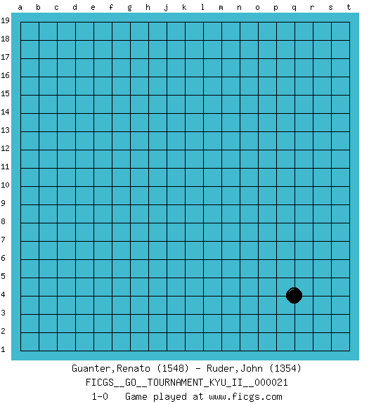 Last move : 1-0 2010 May 30 20:48:29 [Event "FICGS__GO__TOURNAMENT_KYU_II__000021"] [Site "FICGS"] [Date "2010.04.29"] [Round "1"] [Black "Guanter,Renato"] [White "Ruder,John"] [Result "1-0"] [Rating 1 "1548"] [Rating 2 "1354"] 1.q4 1-0 This go game has been lost on time (started : 2010.04.29 10:44:40) Here are the names of the openings (joseki) played in the four corners : Corner q4 : q4 1-0 Hoshi (Hwajeom, Seongjeom, Xingwei`) 4-4 Point. The star or hoshi (4-4) point, emphasizing influence at the potential expense of territory. Player Black won this Go (weiqi, baduk) game. Follow this game move after move (download)The enemy's vital point is your own. (Anonymous) You can only get smarter by playing a smarter opponent. (Revolver, movie)