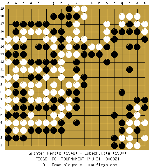 Last move : 1-0 2010 October 16 2:1:33 [Event "FICGS__GO__TOURNAMENT_KYU_II__000021"] [Site "FICGS"] [Date "2010.04.29"] [Round "1"] [Black "Guanter,Renato"] [White "Lubeck,Kate"] [Result "1-0"] [Rating 1 "1548"] [Rating 2 "1500"] 1.q16 d4 2.q4 d16 3.f3 c6 4.k4 k16 5.c14 c12 6.e14 d9 7.f17 f16 8.e17 e16 9.d17 c16 10.d12 d11 11.e12 f10 12.c13 c11 13.g12 h11 14.e6 f4 15.e3 e4 16.d3 c3 17.c2 b3 18.g6 h5 19.h7 h6 20.g7 o17 21.r14 n14 22.c17 g17 23.b12 b11 24.b16 b15 25.b17 c15 26.b14 a14 27.a13 a15 28.g16 g15 29.h3 g4 30.c7 d7 31.d6 d8 32.c5 c4 33.b6 j7 34.j8 h8 35.b9 b10 36.k7 j6 37.k6 g8 38.k8 f7 39.f6 e7 40.a5 b4 41.b5 d5 42.c8 a7 43.b2 a9 44.a3 a4 45.a2 c9 46.h4 g5 47.g3 b7 48.b8 a8 49.c6 a10 50.j5 a6 51.g10 g9 52.f11 e11 53.m13 h12 54.f9 e9 55.e10 f8 56.d10 f10 57.h16 f15 58.f9 a12 59.b13 f10 60.h15 g14 61.f9 h10 62.g13 h13 63.h14 f10 64.f14 g11 65.f12 h17 66.j17 k17 67.h18 j18 68.g18 j14 69.q8 r3 70.q3 r4 71.r5 s5 72.r6 s6 73.s7 q2 74.p2 r2 75.p5 m14 76.n13 o13 77.o12 o15 78.p13 q18 79.r17 r18 80.o14 s17 81.s16 q17 82.r16 s18 83.p15 o16 84.l14 l15 85.k14 k15 86.k11 k13 87.l13 j15 88.k12 j13 89.t6 t4 90.t7 s1 91.q1 t2 92.r11 k10 93.l10 k9 94.l9 j9 95.k18 l18 96.j19 l19 97.p16 r1 98.s3 s4 99.p1 k19 100.j18 t16 101.t15 t17 102.s14 1-0 Here are the names of the openings (joseki) played in the four corners : Corner d4 : d4 f3 Hoshi (Hwajeom, Seongjeom, Xingwei`) 4-4 Point. The star or hoshi (4-4) point, emphasizing influence at the potential expense of territory. Ikken Kakari (Hankan Keolch'im, Yi Gua`jiao~, 1-Space Low Approach). Black 2 is the standard approach move to the 4-4. Corner d16 : d16 c14 Hoshi (Hwajeom, Seongjeom, Xingwei`) 4-4 Point. The star or hoshi (4-4) point, emphasizing influence at the potential expense of territory. Ikken Kakari (Hankan Keolch'im, Yi Gua`jiao~, 1-Space Low Approach). Black 2 is the standard approach move to the 4-4. Corner q16 : q16 o17 Hoshi (Hwajeom, Seongjeom, Xingwei`) 4-4 Point. The star or hoshi (4-4) point, emphasizing influence at the potential expense of territory. Ikken Kakari (Hankan Keolch'im, Yi Gua`jiao~, 1-Space Low Approach). White 2 is the standard approach move to the 4-4. Player Black won this Go (weiqi, baduk) game. Follow this game move after move (download)Don't count territory held by only one eye. (Anonymous) History is a gallery of pictures in which there are few originals and many copies. (Alexis de Tocqueville)