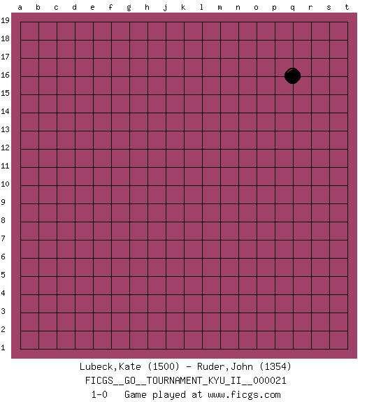 Last move : 1-0 2010 May 30 8:48:23 [Event "FICGS__GO__TOURNAMENT_KYU_II__000021"] [Site "FICGS"] [Date "2010.04.29"] [Round "1"] [Black "Lubeck,Kate"] [White "Ruder,John"] [Result "1-0"] [Rating 1 "1500"] [Rating 2 "1354"] 1.q16 1-0 This go game has been lost on time (started : 2010.04.29 10:44:40) Here are the names of the openings (joseki) played in the four corners : Player Black won this Go (weiqi, baduk) game. Follow this game move after move (download)Six eyes in a rectangle are alive. (Anonymous) Some people are so afraid to die that they never begin to live. (Henry Van Dyke)