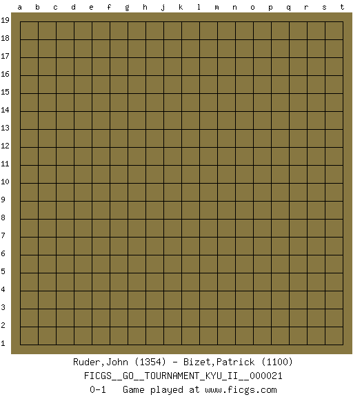 Last move : 0-1 2010 May 29 20:45:59 [Event "FICGS__GO__TOURNAMENT_KYU_II__000021"] [Site "FICGS"] [Date "2010.04.29"] [Round "1"] [Black "Ruder,John"] [White "Bizet,Patrick"] [Result "0-1"] [Rating 1 "1354"] [Rating 2 "1100"] 0-1 This go game has been lost on time (started : 2010.04.29 10:44:40) Here are the names of the openings (joseki) played in the four corners : Player White won this Go (weiqi, baduk) game. Follow this game move after move (download)Keep inessential ataris till the end. (Anonymous) When you've done things right people won't know you've done anything at all. (Futurama)