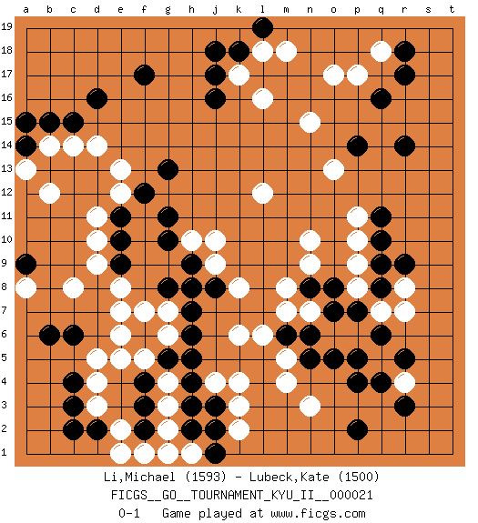Last move : 0-1 2010 October 19 22:0:3 [Event "FICGS__GO__TOURNAMENT_KYU_II__000021"] [Site "FICGS"] [Date "2010.04.29"] [Round "1"] [Black "Li,Michael"] [White "Lubeck,Kate"] [Result "0-1"] [Rating 1 "1593"] [Rating 2 "1500"] 1.q16 d4 2.d16 r4 3.p4 n3 4.p2 k4 5.q6 c14 6.f17 d11 7.c6 c8 8.c3 d3 9.c4 d5 10.b6 e7 11.r3 o17 12.r14 l16 13.j17 k17 14.j16 q18 15.r17 n15 16.q10 l12 17.h4 g3 18.j3 k3 19.j2 k2 20.h6 k6 21.n5 m4 22.h8 j9 23.j8 k8 24.h9 j10 25.g11 n10 26.e9 d9 27.g13 n7 28.q4 r8 29.q8 r7 30.r5 q7 31.p7 p8 32.q9 p6 33.o7 o6 34.o8 p9 35.n8 m8 36.n6 m7 37.p5 n9 38.o5 m5 39.m6 l6 40.r9 p10 41.q11 p11 42.p14 o13 43.b15 b14 44.c15 d14 45.d2 e2 46.c2 j4 47.h3 g4 48.g5 f5 49.f6 e6 50.f4 e5 51.f3 g2 52.f2 f1 53.g1 h1 54.h2 g1 55.j1 e1 56.k18 l18 57.j18 h10 58.g10 g7 59.g8 f7 60.h7 g6 61.h5 e8 62.e10 d10 63.e11 e12 64.f12 e13 65.r18 p17 66.l19 m18 67.a14 a13 68.a15 b12 69.a9 a8 0-1 This go game has been lost on time (started : 2010.04.29 10:44:40) Here are the names of the openings (joseki) played in the four corners : Corner q4 : r4 p4 Komoku (Somok, Xiao~mu`) 3-4 Point. The komoku (3-4) point is the traditional corner enclosure move.. Ikken Takagakari (Hankan Nop'dakeolch'im, Yi Gaogua`jiao~, 1-Space High Approach). The 5-4 approach move has become more popular in modern times, as modern Go emphasizes speed and influence. Corner d16 : d16 c14 Hoshi (Hwajeom, Seongjeom, Xingwei`) 4-4 Point. The star or hoshi (4-4) point, emphasizing influence at the potential expense of territory. Ikken Kakari (Hankan Keolch'im, Yi Gua`jiao~, 1-Space Low Approach). White 2 is the standard approach move to the 4-4. Corner d4 : d4 c6 Hoshi (Hwajeom, Seongjeom, Xingwei`) 4-4 Point. The star or hoshi (4-4) point, emphasizing influence at the potential expense of territory. Ikken Kakari (Hankan Keolch'im, Yi Gua`jiao~, 1-Space Low Approach). Black 2 is the standard approach move to the 4-4. Corner q16 : q16 o17 Hoshi (Hwajeom, Seongjeom, Xingwei`) 4-4 Point. The star or hoshi (4-4) point, emphasizing influence at the potential expense of territory. Ikken Kakari (Hankan Keolch'im, Yi Gua`jiao~, 1-Space Low Approach). White 2 is the standard approach move to the 4-4. Player White won this Go (weiqi, baduk) game. Follow this game move after move (download)Everything would seem to be possible in Go. Like pulling a rabbit, by a magical move, out of a hat. (Pierre Audouard) I know the human being and fish can coexist peacefully. (George W. Bush, Saginaw sept. 29, 2000)
